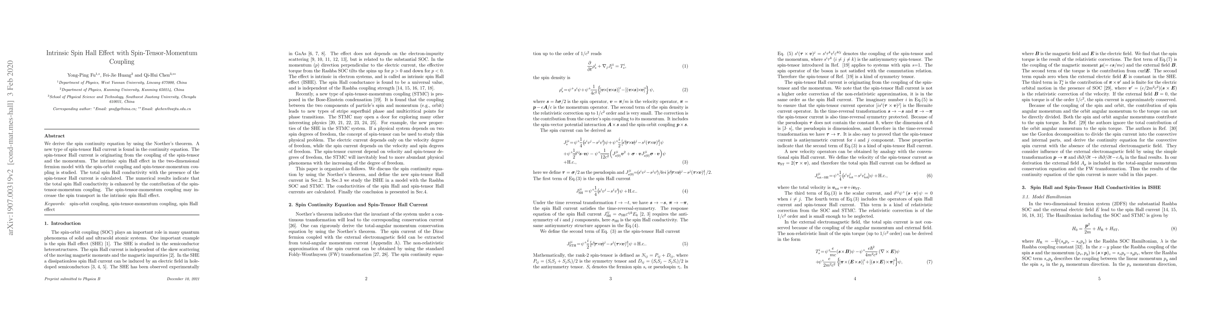 This paper derives the spin continuity equation using Noether's theorem and identifies a new spin-tensor Hall current arising from spin-tensor and momentum coupling. The intrinsic spin Hall effect in a two-dimensional fermion model with spin-orbit and spin-tensor-momentum coupling is analyzed, revealing enhanced total spin Hall conductivity due to the spin-tensor-momentum coupling.