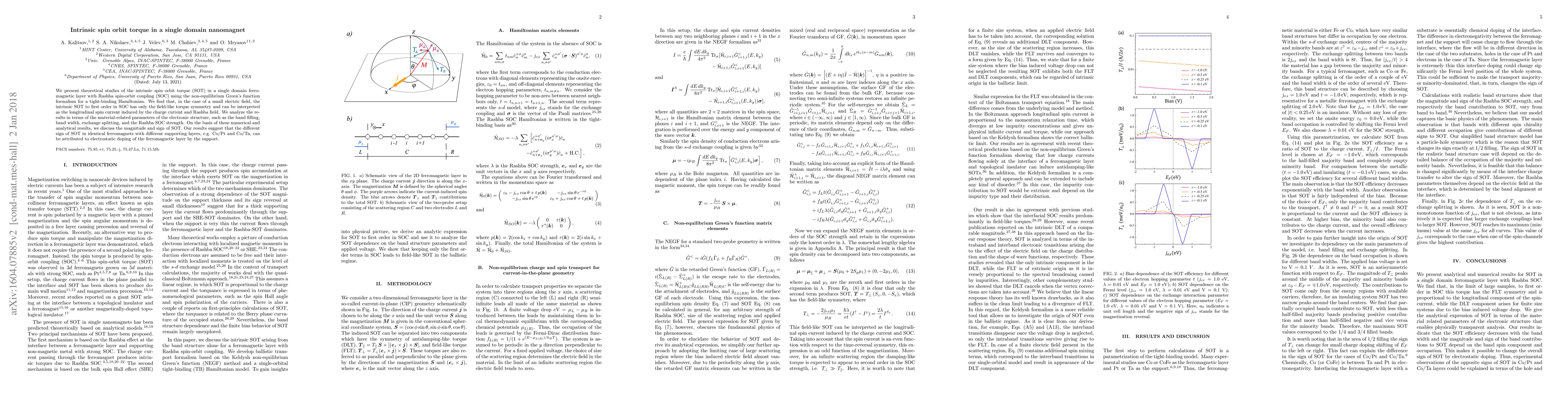 This paper theoretically investigates intrinsic spin orbit torque in single domain ferromagnetic nanomagnets with Rashba spin-orbit coupling, revealing that it exhibits only field-like symmetry and is influenced by material parameters like band filling and Rashba strength. The study also explains differing SOT signs in similar ferromagnetic layers based on electrostatic doping effects from different supporting layers.