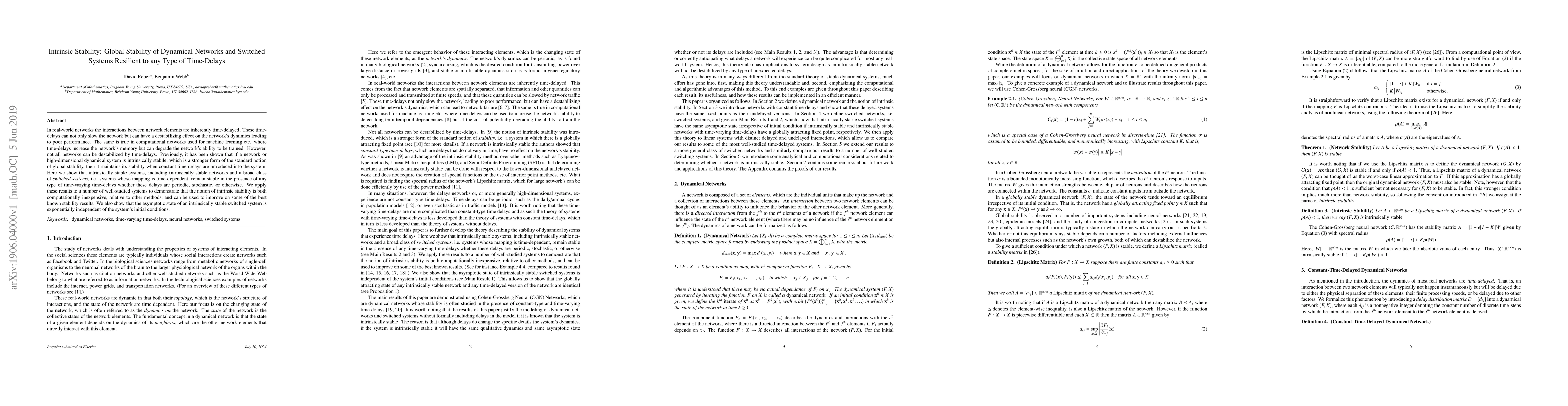 This research demonstrates that intrinsically stable systems, including networks and switched systems, maintain stability despite various time-varying delays. It shows that this stability holds for periodic, stochastic, or other types of time-delays, and that the asymptotic state of an intrinsically stable switched system is exponentially independent of initial conditions. The method is computationally efficient and improves upon existing stability results.