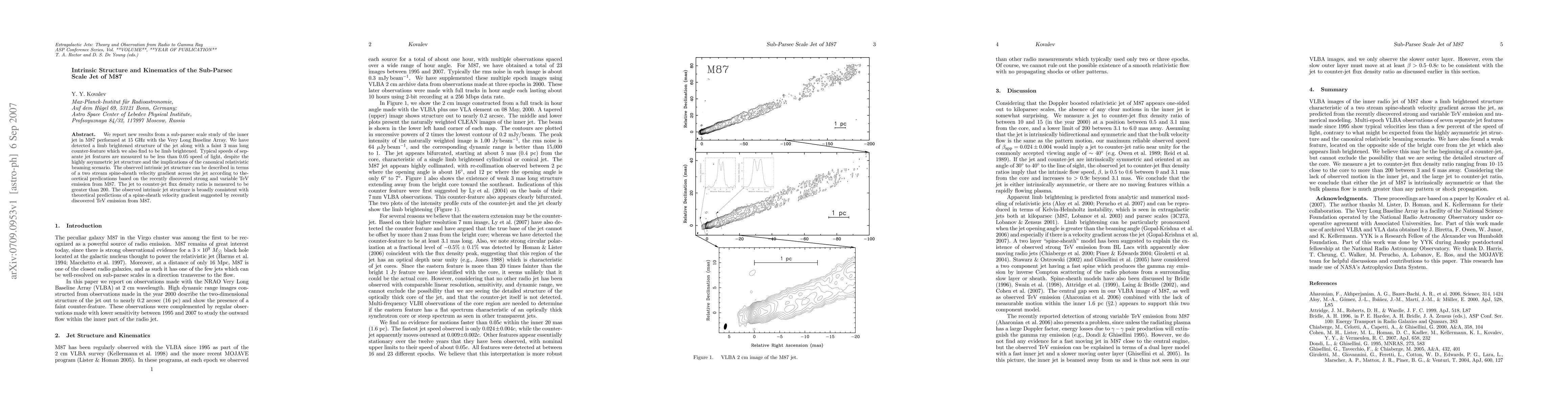 We report new results from a sub-parsec scale study of the inner jet in M87 performed at 15 GHz with the Very Long Baseline Array. We have detected a limb brightened structure of the jet along with a faint 3 mas long counter-feature which we also find to be limb brightened. Typical speeds of separate jet features are measured to be less than 0.05 speed of light, despite the highly asymmetric jet structure and the implications of the canonical relativistic beaming scenario. The observed intrinsic jet structure can be described in terms of a two stream spine-sheath velocity gradient across the jet according to theoretical predications based on the recently discovered strong and variable TeV emission from M87. The jet to counter-jet flux density ratio is measured to be greater than 200. The observed intrinsic jet structure is broadly consistent with theoretical predictions of a spine-sheath velocity gradient suggested by recently discovered TeV emission from M87.