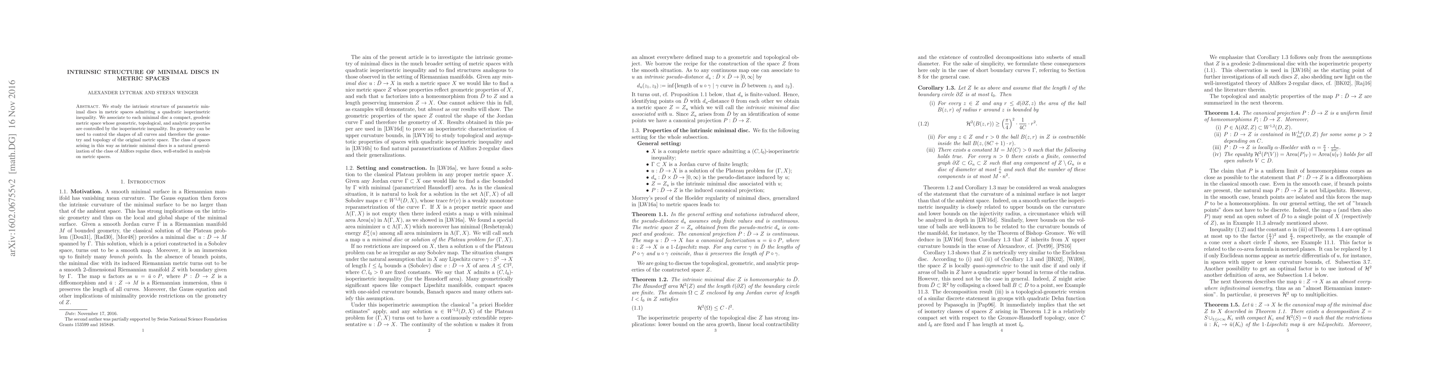 We study the intrinsic structure of parametric minimal discs in metric spaces admitting a quadratic isoperimetric inequality. We associate to each minimal disc a compact, geodesic metric space whose geometric, topological, and analytic properties are controlled by the isoperimetric inequality. Its geometry can be used to control the shapes of all curves and therefore the geometry and topology of the original metric space. The class of spaces arising in this way as intrinsic minimal discs is a natural generalization of the class of Ahlfors regular discs, well-studied in analysis on metric spaces.