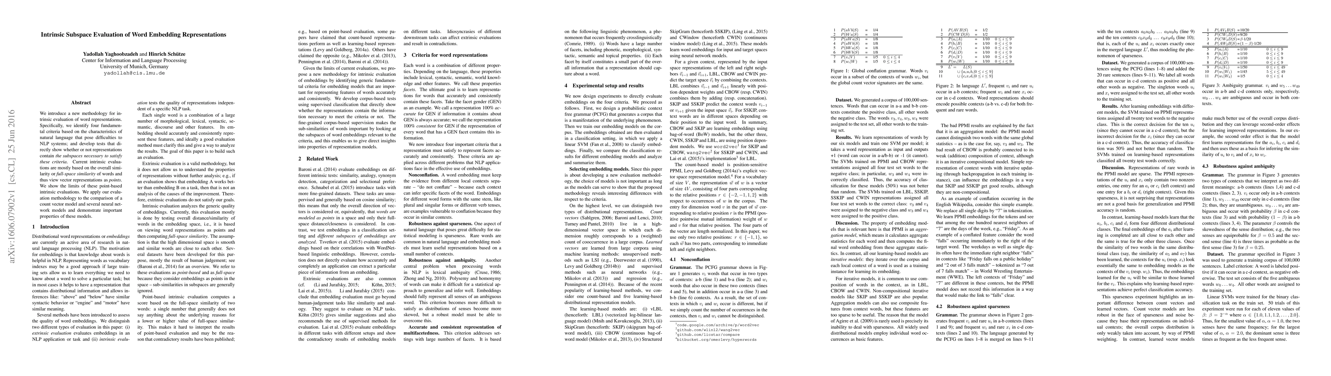 We introduce a new methodology for intrinsic evaluation of word representations. Specifically, we identify four fundamental criteria based on the characteristics of natural language that pose difficulties to NLP systems; and develop tests that directly show whether or not representations contain the subspaces necessary to satisfy these criteria. Current intrinsic evaluations are mostly based on the overall similarity or full-space similarity of words and thus view vector representations as points. We show the limits of these point-based intrinsic evaluations. We apply our evaluation methodology to the comparison of a count vector model and several neural network models and demonstrate important properties of these models.