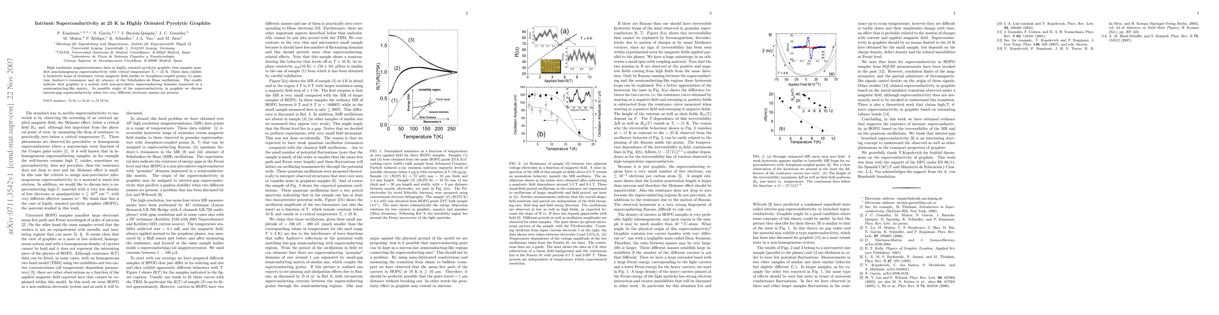 Summary: High resolution studies reveal intrinsic superconductivity in highly oriented pyrolytic graphite at $T_c \sim 25$ K, characterized by hysteretic resistance-magnetic field loops, quantum Andreev’s resonances, and absence of Schubnikov-de Haas oscillations, suggesting non-percolative superconducting domains in a semiconducting matrix.