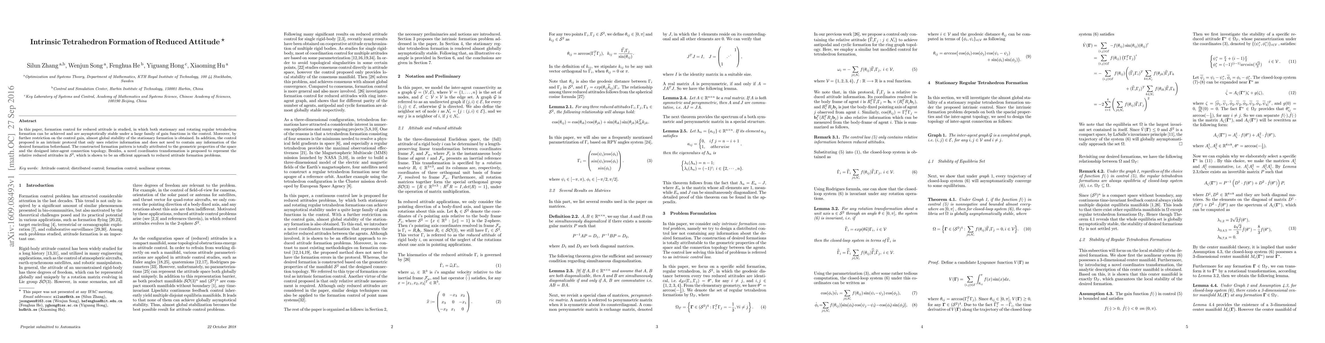 In this paper, formation control for reduced attitude is studied, in which both stationary and rotating regular tetrahedron formation can be achieved and are asymptotically stable under a large family of gain functions in the control. Moreover, by further restriction on the control gain, almost global stability of the stationary formation is obtained. In addition, the control proposed is an intrinsic protocol that only uses relative information and does not need to contain any information of the desired formation beforehand. The constructed formation pattern is totally attributed to the geometric properties of the space and the designed inter-agent connection topology. Besides, a novel coordinates transformation is proposed to represent the relative reduced attitudes in S^2, which is shown to be an efficient approach to reduced attitude formation problems.