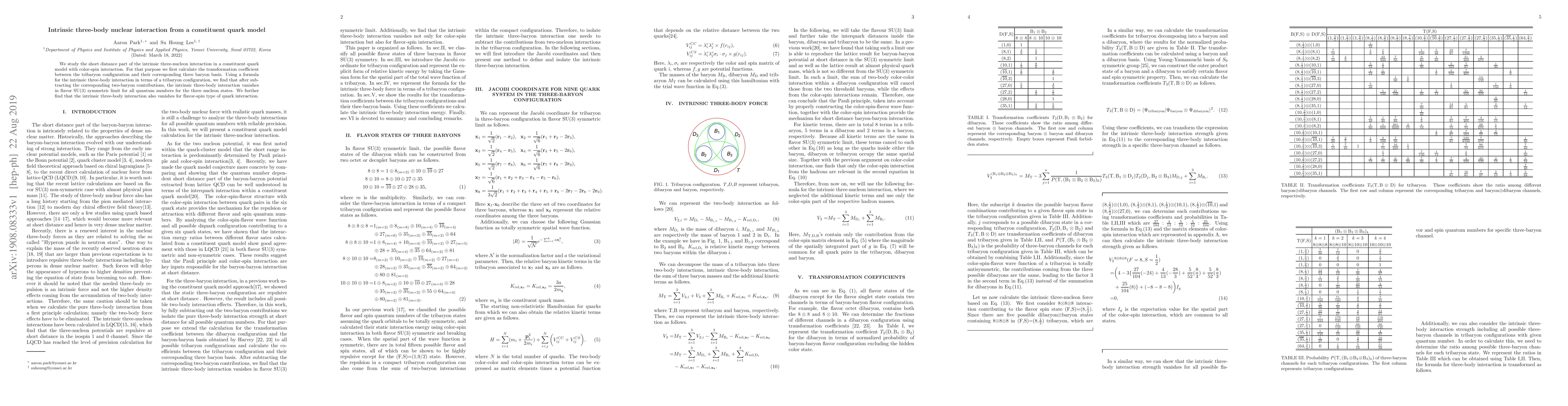 We study the short distance part of the intrinsic three-nucleon interaction in a constituent quark model with color-spin interaction. For that purpose we first calculate the transformation coefficient between the tribaryon configuration and their corresponding three baryon basis. Using a formula for the intrinsic three-body interaction in terms of a tribaryon configuration, we find that after subtracting the corresponding two-baryon contributions, the intrinsic three-body interaction vanishes in flavor SU(3) symmetric limit for all quantum numbers for the three nucleon states. We further find that the intrinsic three-body interaction also vanishes for flavor-spin type of quark interaction.