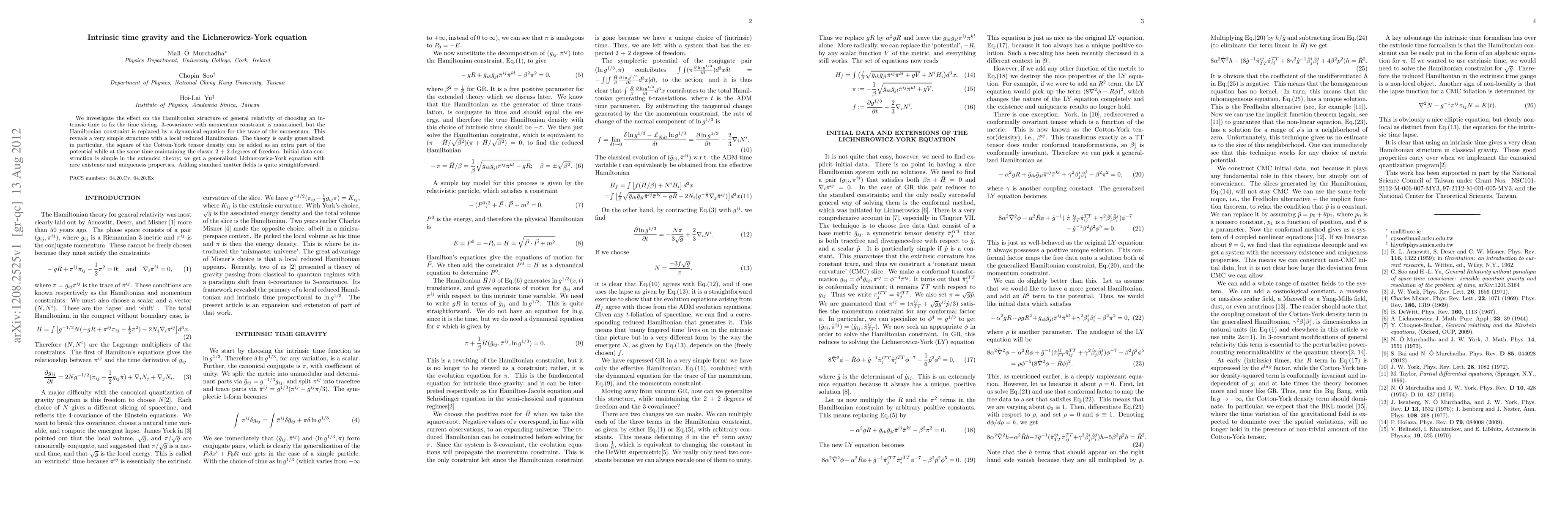 We investigate the effect on the Hamiltonian structure of general relativity of choosing an intrinsic time to fix the time slicing. 3-covariance with momentum constraint is maintained, but the Hamiltonian constraint is replaced by a dynamical equation for the trace of the momentum. This reveals a very simple structure with a local reduced Hamiltonian. The theory is easily generalised; in particular, the square of the Cotton-York tensor density can be added as an extra part of the potential while at the same time maintaining the classic 2 + 2 degrees of freedom. Initial data construction is simple in the extended theory; we get a generalised Lichnerowicz-York equation with nice existence and uniqueness properties. Adding standard matter fields is quite straightforward.