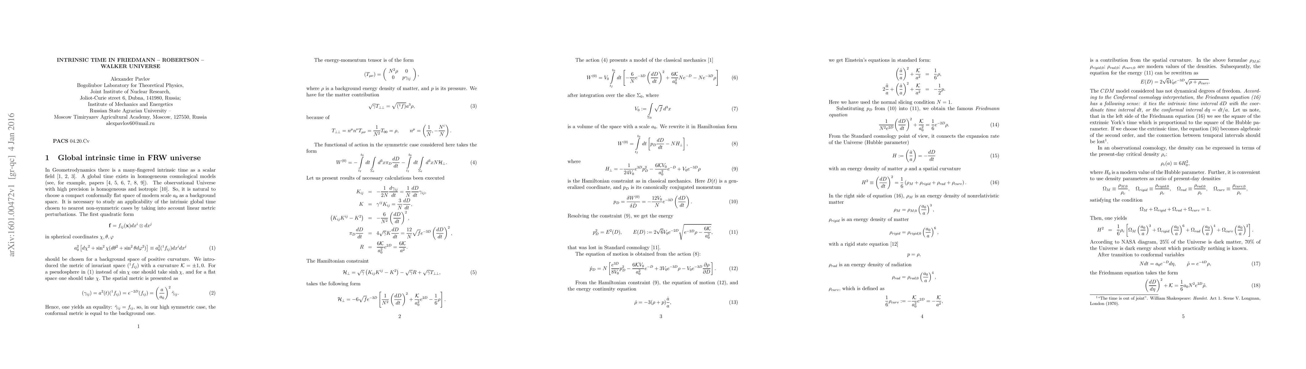 This paper explores the concept of intrinsic time in Friedmann-Robertson-Walker models, showing it is proportional to the scaling factor of the spatial metric. It investigates how this intrinsic time applies to non-symmetric cases with linear metric perturbations, finding scalar perturbations affect the effective energy density in Hubble's law, while vector and tensor perturbations do not influence intrinsic time.
