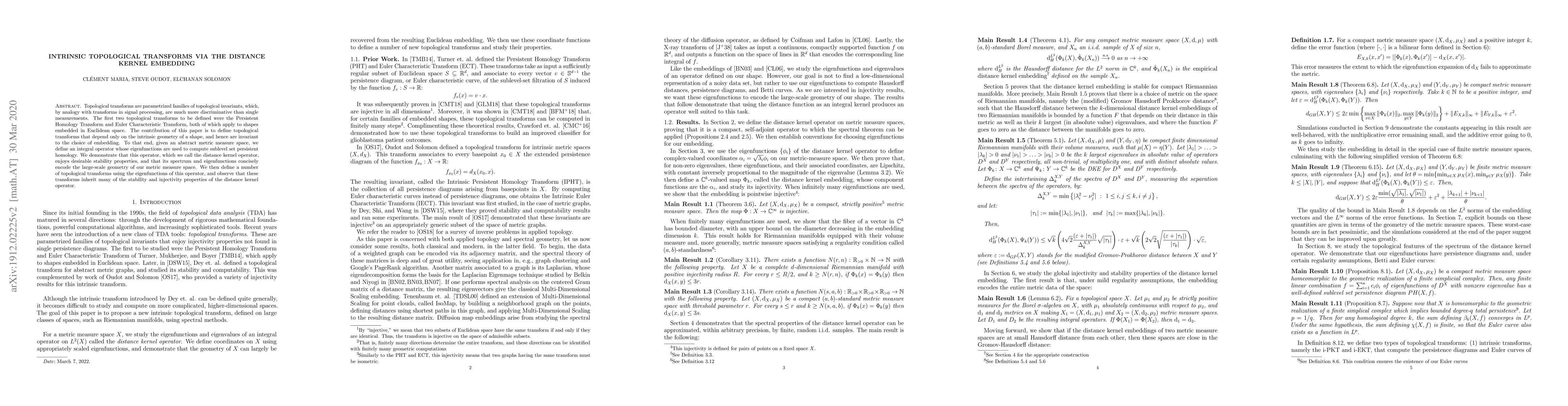 This paper introduces intrinsic topological transforms based on the distance kernel embedding, which are invariant to the choice of shape embedding. These transforms, derived from eigenfunctions of a new integral operator, encode the large-scale geometry of a metric measure space and inherit stability properties from the distance kernel operator.