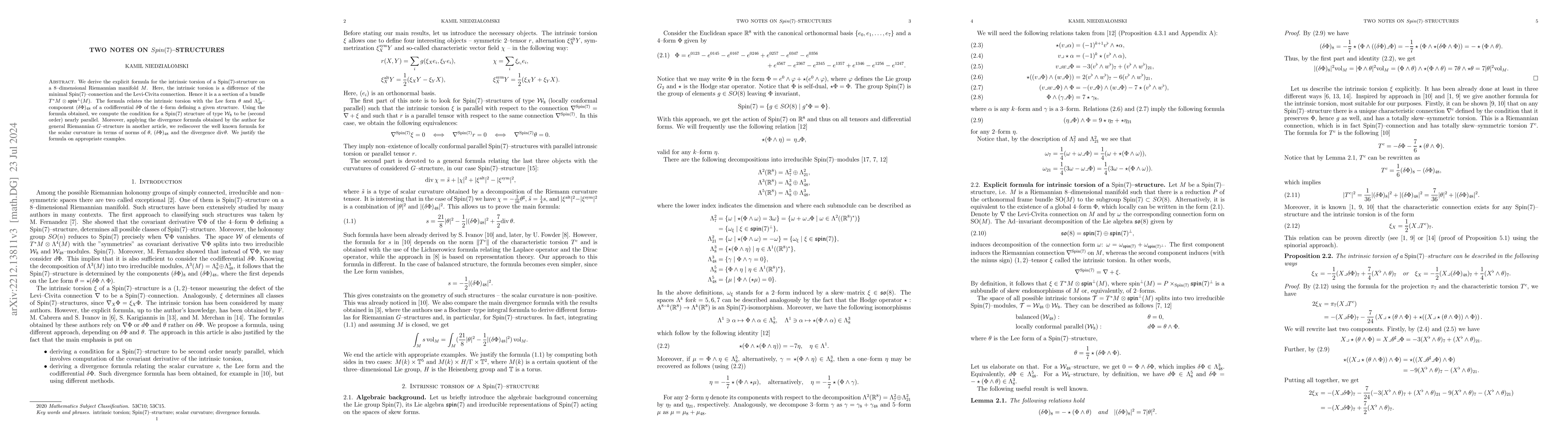This paper derives an explicit formula for the intrinsic torsion of a Spin(7)-structure on an 8-dimensional Riemannian manifold, linking it to the Lee form and a codifferential component. It also provides a formula for the scalar curvature in terms of these quantities and their divergences, validated through specific examples.