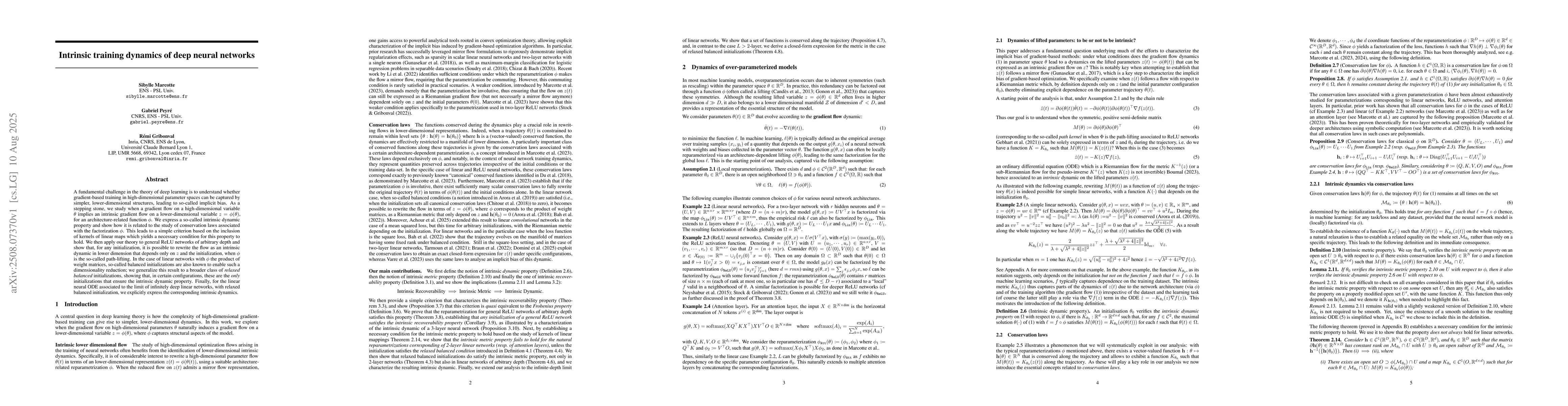 A fundamental challenge in the theory of deep learning is to understand whether gradient-based training in high-dimensional parameter spaces can be captured by simpler, lower-dimensional structures, leading to so-called implicit bias. As a stepping stone, we study when a gradient flow on a high-dimensional variable $\theta$ implies an intrinsic gradient flow on a lower-dimensional variable $z = \phi(\theta)$, for an architecture-related function $\phi$. We express a so-called intrinsic dynamic property and show how it is related to the study of conservation laws associated with the factorization $\phi$. This leads to a simple criterion based on the inclusion of kernels of linear maps which yields a necessary condition for this property to hold. We then apply our theory to general ReLU networks of arbitrary depth and show that, for any initialization, it is possible to rewrite the flow as an intrinsic dynamic in a lower dimension that depends only on $z$ and the initialization, when $\phi$ is the so-called path-lifting. In the case of linear networks with $\phi$ the product of weight matrices, so-called balanced initializations are also known to enable such a dimensionality reduction; we generalize this result to a broader class of {\em relaxed balanced} initializations, showing that, in certain configurations, these are the \emph{only} initializations that ensure the intrinsic dynamic property. Finally, for the linear neural ODE associated with the limit of infinitely deep linear networks, with relaxed balanced initialization, we explicitly express the corresponding intrinsic dynamics.