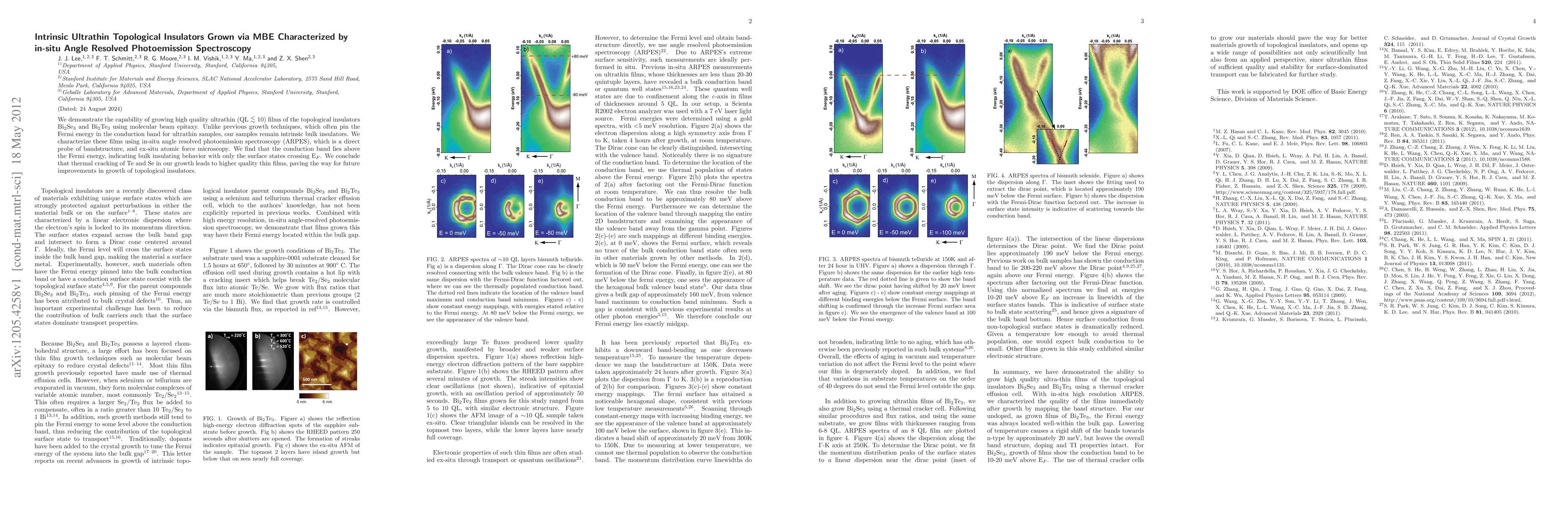 We demonstrate the capability of growing high quality ultrathin films of the topological insulators Bi2Se3 and Bi2Te3 using molecular beam epitaxy. Unlike previous growth techniques, which often pin the Fermi energy in the conduction band for ultrathin samples, our samples remain intrinsic bulk insulators. We characterize these films using in-situ angle resolved photoemission spectroscopy (ARPES), which is a direct probe of bandstructure, and ex-situ atomic force microscopy. We find that the conduction band lies above the Fermi energy, indicating bulk insulating behavior with only the surface states crossing EF . We conclude that thermal cracking of Te and Se in our growth leads to higher quality thin films, paving the way for future improvements in growth of topological insulators.