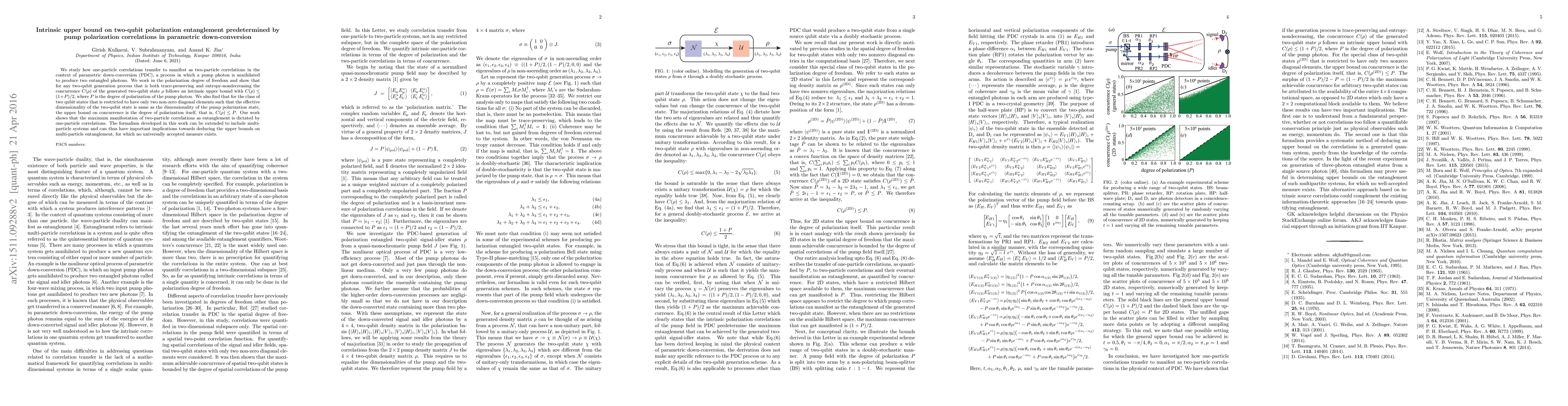 The study finds that the maximum two-qubit polarization entanglement is predetermined by pump photon correlations in parametric down-conversion, with an upper bound of (1+P)/2 or P for specific states.