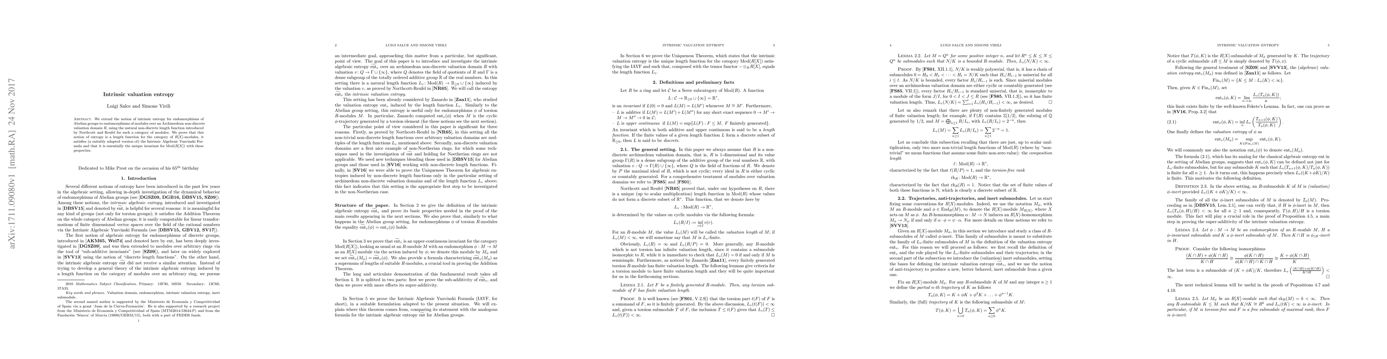 We extend the notion of intrinsic entropy for endomorphisms of Abelian groups to endomorphisms of modules over an Archimedean non-discrete valuation domain $R$, using the natural non-discrete length function introduced by Northcott and Reufel for such a category of modules. We prove that this notion of entropy is a length function for the category of $R[X]$-modules, it satisfies (a suitably adapted version of) the Intrinsic Algebraic Yuzvinski Formula and that it is essentially the unique invariant for $Mod(R[X])$ with these properties.