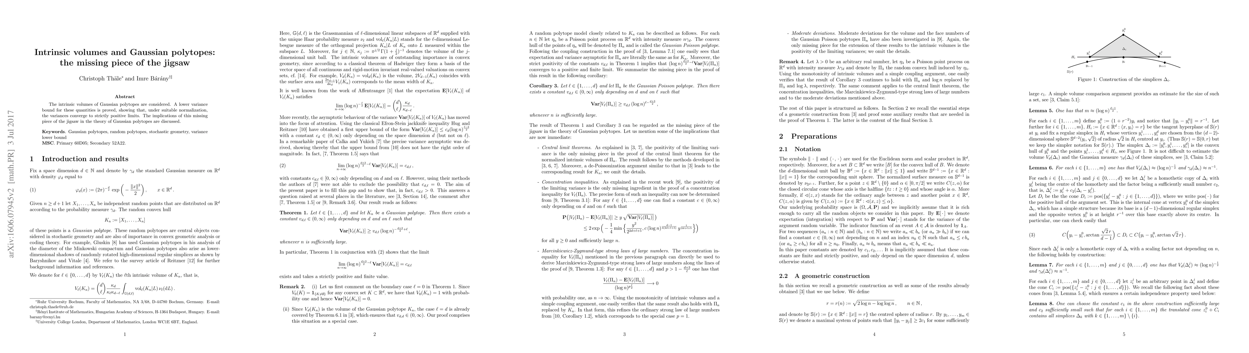 The intrinsic volumes of Gaussian polytopes are considered. A lower variance bound for these quantities is proved, showing that, under suitable normalization, the variances converge to strictly positive limits. The implications of this missing piece of the jigsaw in the theory of Gaussian polytopes are discussed.