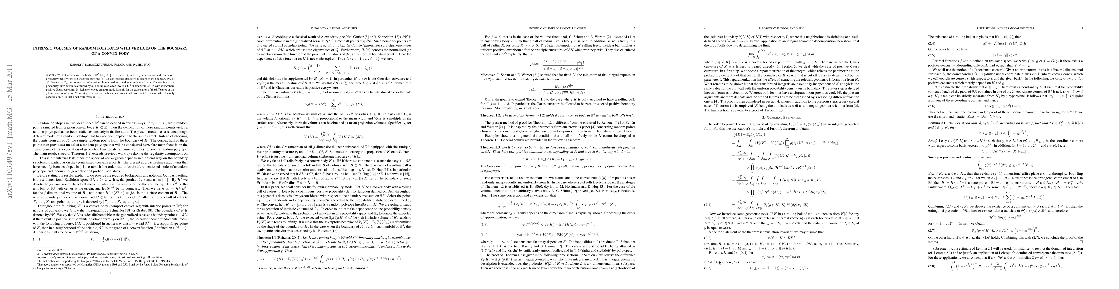 Let $K$ be a convex body in $\R^d$, let $j\in\{1, ..., d-1\}$, and let $\varrho$ be a positive and continuous probability density function with respect to the $(d-1)$-dimensional Hausdorff measure on the boundary $\partial K$ of $K$. Denote by $K_n$ the convex hull of $n$ points chosen randomly and independently from $\partial K$ according to the probability distribution determined by $\varrho$. For the case when $\partial K$ is a $C^2$ submanifold of $\R^d$ with everywhere positive Gauss curvature, M. Reitzner proved an asymptotic formula for the expectation of the difference of the $j$th intrinsic volumes of $K$ and $K_n$, as $n\to\infty$. In this article, we extend this result to the case when the only condition on $K$ is that a ball rolls freely in $K$.