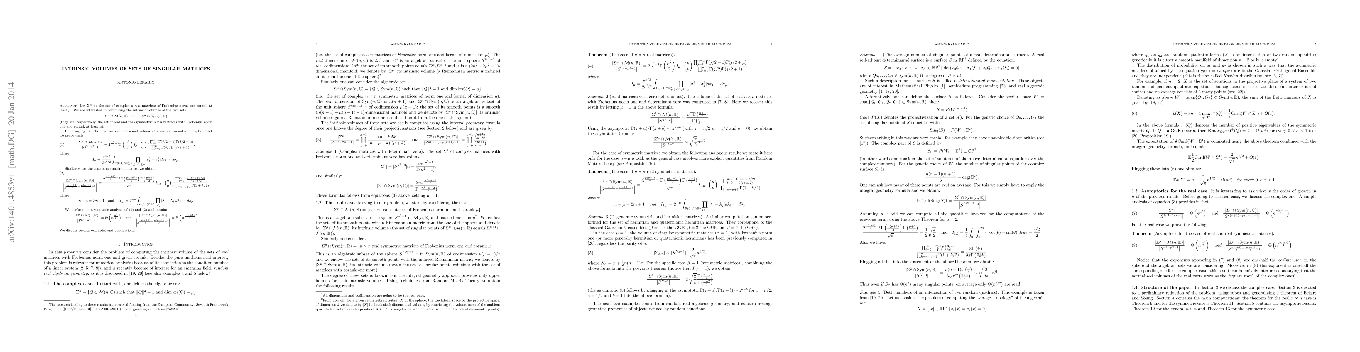 We explicitly compute the intrinsic volume of the set of real (and real symmetric) matrices of Frobenius norm one and given corank (the case of matrices with zero determinant as a special case). We give asymptotic formulas for our computations and we discuss several examples and applications.