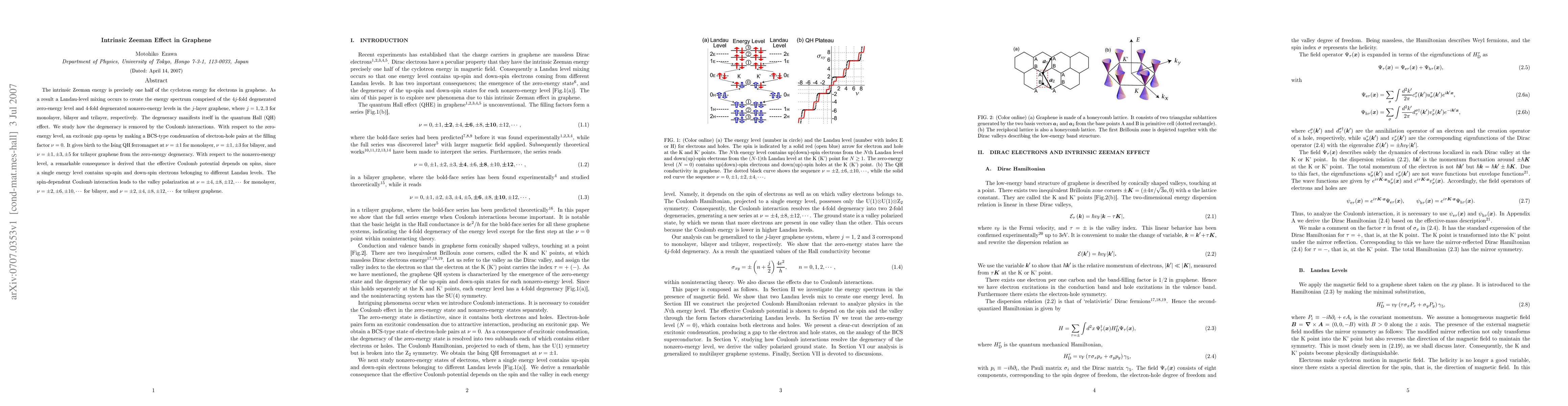 Graphene exhibits intrinsic Zeeman effect, resulting in degenerate energy levels that lead to novel quantum Hall effects and valley polarization under the influence of Coulomb interactions.