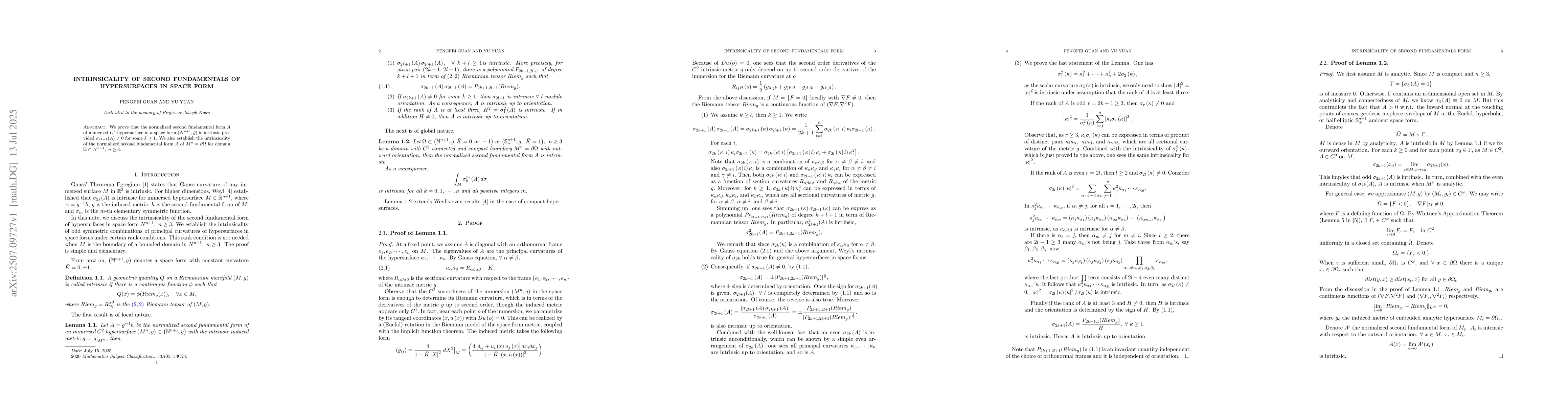 We prove that the normalized second fundamental form $A$ of immersed $C^2$ hypersurface in a space form $(N^{n+1}, \bar g)$ is intrinsic provided $\sigma_{2k+1}(A)\neq 0$ for some $k\ge 1$. We also establish the intrinsicality of the normalized second fundamental form $A$ of $M^{n}=\partial\Omega$ for domain $ \Omega\subset N^{n+1}, \ n\ge 3$.