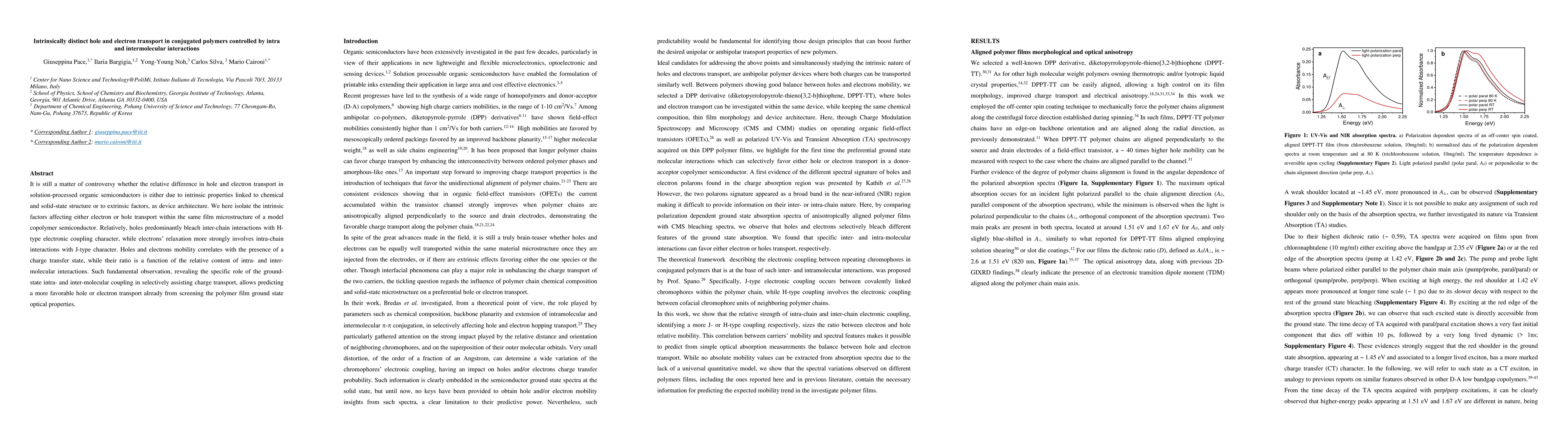 This paper investigates how intra- and intermolecular interactions affect hole and electron transport in conjugated polymers, finding that holes rely on inter-chain interactions while electrons rely on intra-chain interactions.