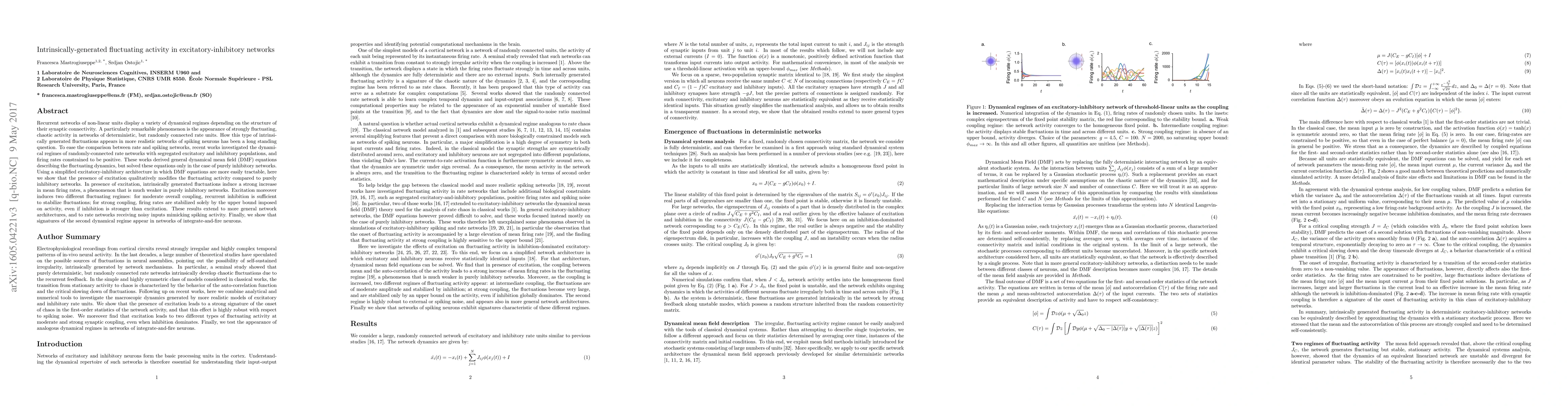 Recurrent networks of non-linear units display a variety of dynamical regimes depending on the structure of their synaptic connectivity. A particularly remarkable phenomenon is the appearance of strongly fluctuating, chaotic activity in networks of deterministic, but randomly connected rate units. How this type of intrinsi- cally generated fluctuations appears in more realistic networks of spiking neurons has been a long standing question. To ease the comparison between rate and spiking networks, recent works investigated the dynami- cal regimes of randomly-connected rate networks with segregated excitatory and inhibitory populations, and firing rates constrained to be positive. These works derived general dynamical mean field (DMF) equations describing the fluctuating dynamics, but solved these equations only in the case of purely inhibitory networks. Using a simplified excitatory-inhibitory architecture in which DMF equations are more easily tractable, here we show that the presence of excitation qualitatively modifies the fluctuating activity compared to purely inhibitory networks. In presence of excitation, intrinsically generated fluctuations induce a strong increase in mean firing rates, a phenomenon that is much weaker in purely inhibitory networks. Excitation moreover induces two different fluctuating regimes: for moderate overall coupling, recurrent inhibition is sufficient to stabilize fluctuations, for strong coupling, firing rates are stabilized solely by the upper bound imposed on activity, even if inhibition is stronger than excitation. These results extend to more general network architectures, and to rate networks receiving noisy inputs mimicking spiking activity. Finally, we show that signatures of the second dynamical regime appear in networks of integrate-and-fire neurons.