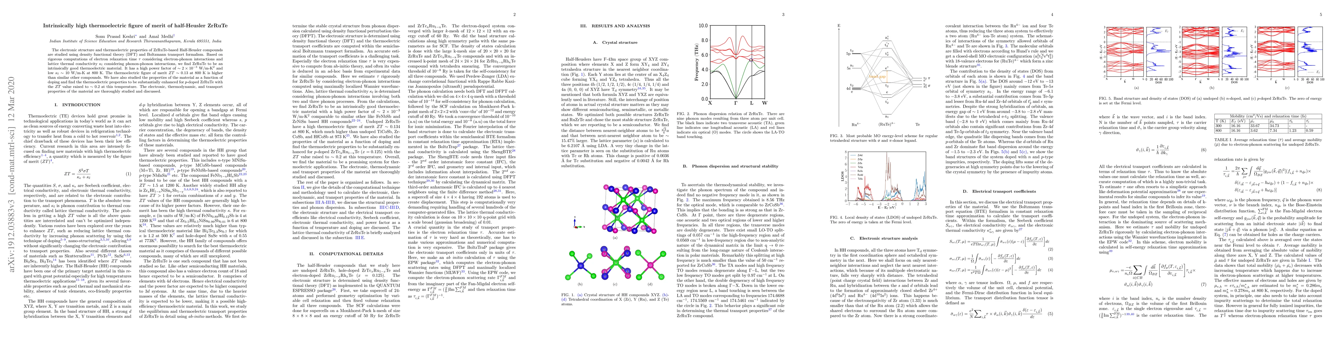 ZrRuTe-based Half-Heusler compounds exhibit a high thermoelectric figure of merit $ZT \sim 0.13$ at 800 K, enhanced to $\sim 0.2$ with $p$-doping, due to a high power factor and low lattice thermal conductivity.