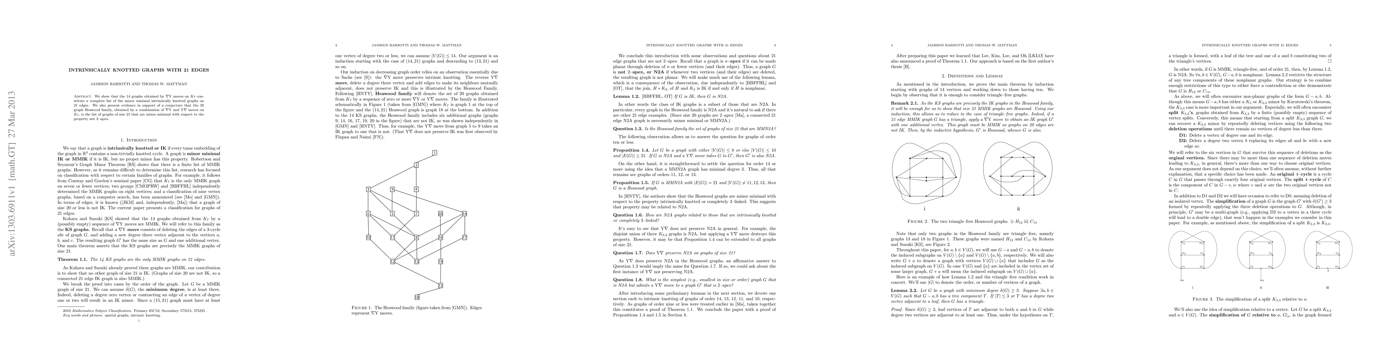 This paper identifies 14 intrinsically knotted graphs on 21 edges derived from K_7 through $\nabla\mathrm{Y}$ moves, establishing them as the complete set of minor minimal intrinsically knotted graphs of this size. Additionally, the paper supports a conjecture that the 20 graph Heawood family, formed via $\nabla\mathrm{Y}$ and $\mathrm{Y}\nabla$ moves on K_7, represents the minor minimal graphs of size 21 that lack the 2--apex property.