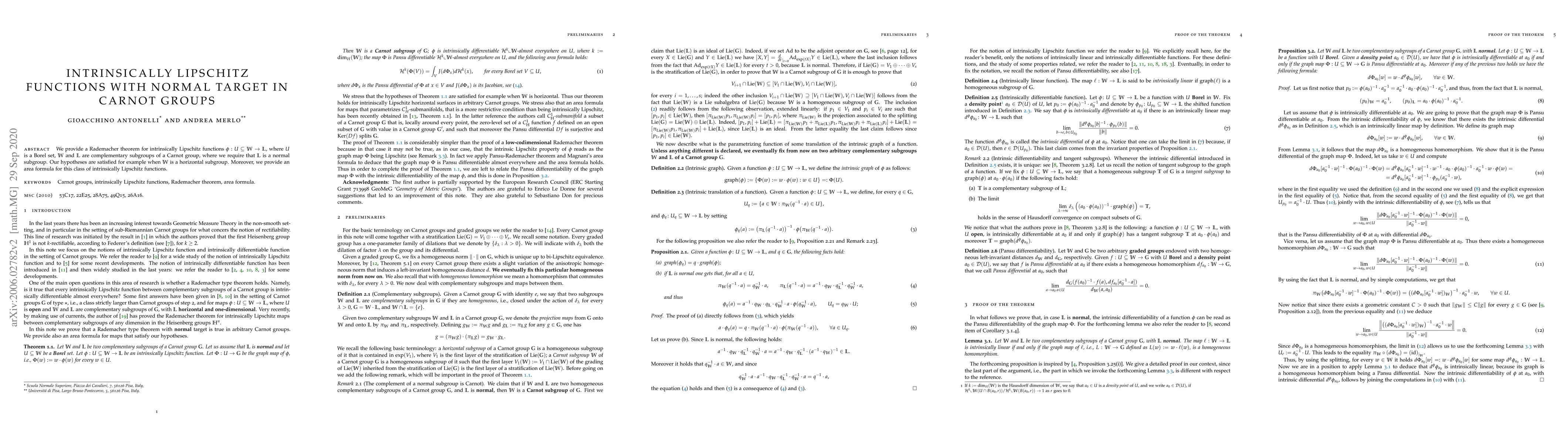 We provide a Rademacher theorem for intrinsically Lipschitz functions $\phi:U\subseteq \mathbb W\to \mathbb L$, where $U$ is a Borel set, $\mathbb W$ and $\mathbb L$ are complementary subgroups of a Carnot group, where we require that $\mathbb L$ is a normal subgroup. Our hypotheses are satisfied for example when $\mathbb W$ is a horizontal subgroup. Moreover, we provide an area formula for this class of intrinsically Lipschitz functions.
