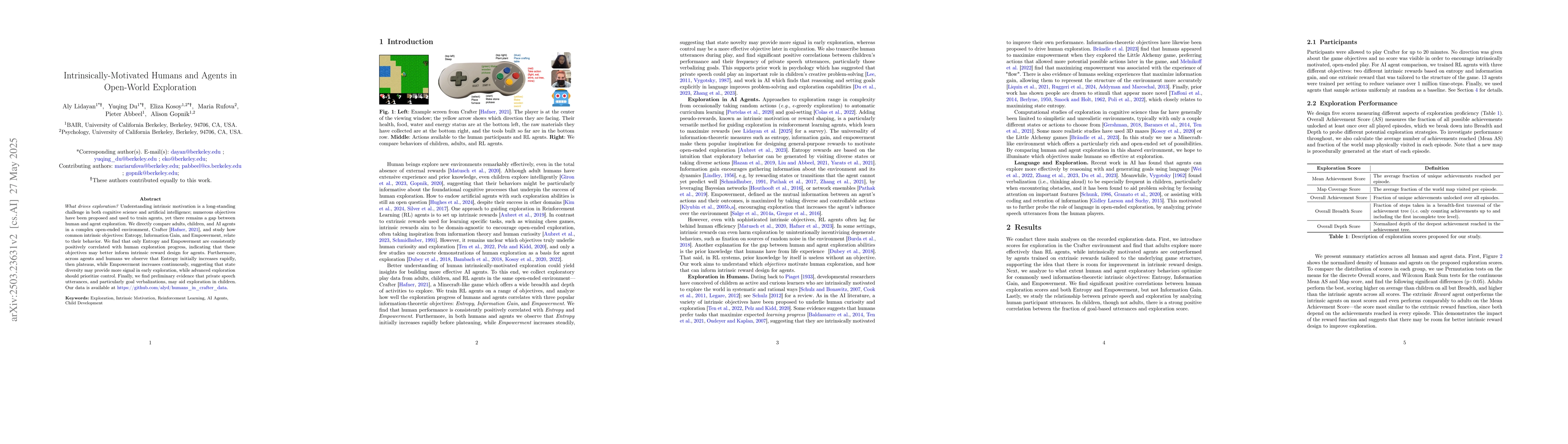 Researchers studied human exploration in an open-world environment to understand intrinsic motivation, finding that entropy and empowerment objectives correlate with exploration progress in both humans and AI agents. Their findings suggest design principles for intrinsic reward systems and potential benefits of verbal goal-setting for children's exploration.