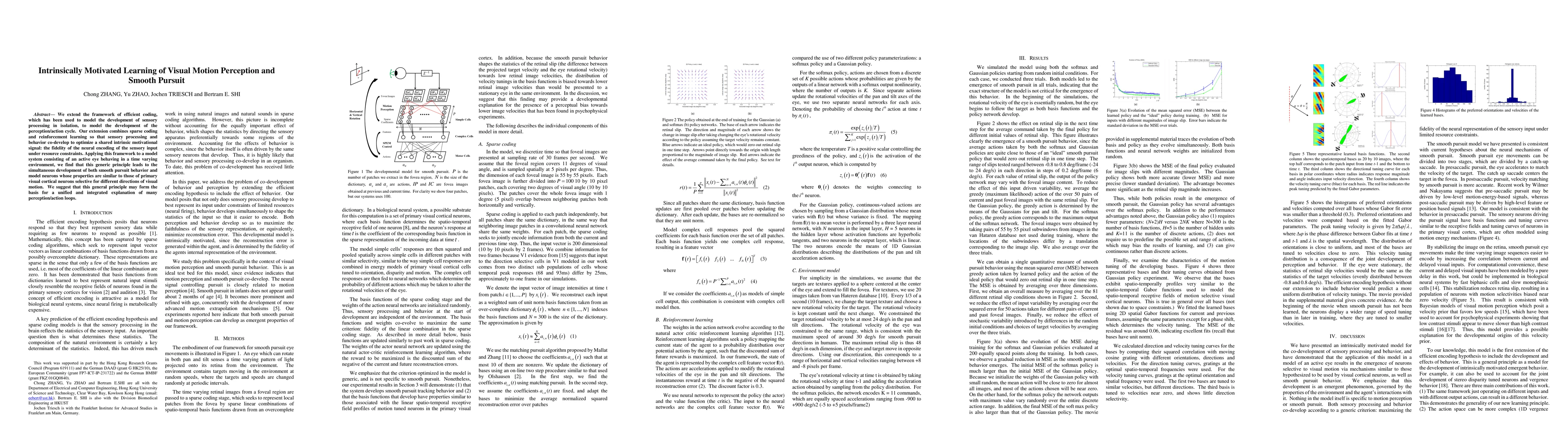 We extend the framework of efficient coding, which has been used to model the development of sensory processing in isolation, to model the development of the perception/action cycle. Our extension combines sparse coding and reinforcement learning so that sensory processing and behavior co-develop to optimize a shared intrinsic motivational signal: the fidelity of the neural encoding of the sensory input under resource constraints. Applying this framework to a model system consisting of an active eye behaving in a time varying environment, we find that this generic principle leads to the simultaneous development of both smooth pursuit behavior and model neurons whose properties are similar to those of primary visual cortical neurons selective for different directions of visual motion. We suggest that this general principle may form the basis for a unified and integrated explanation of many perception/action loops.