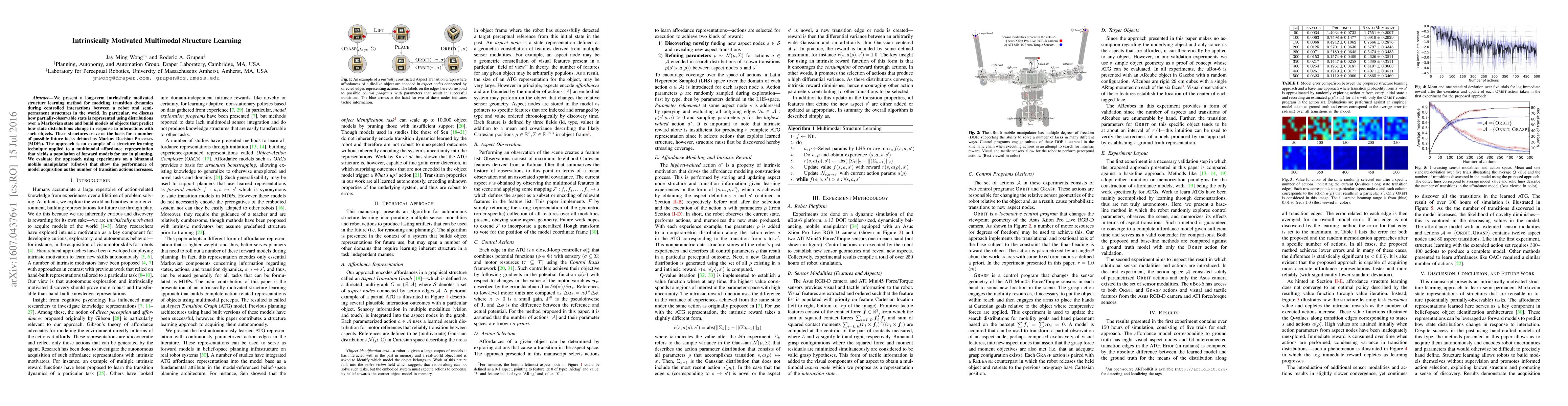 We present a long-term intrinsically motivated structure learning method for modeling transition dynamics during controlled interactions between a robot and semi-permanent structures in the world. In particular, we discuss how partially-observable state is represented using distributions over a Markovian state and build models of objects that predict how state distributions change in response to interactions with such objects. These structures serve as the basis for a number of possible future tasks defined as Markov Decision Processes (MDPs). The approach is an example of a structure learning technique applied to a multimodal affordance representation that yields a population of forward models for use in planning. We evaluate the approach using experiments on a bimanual mobile manipulator (uBot-6) that show the performance of model acquisition as the number of transition actions increases.