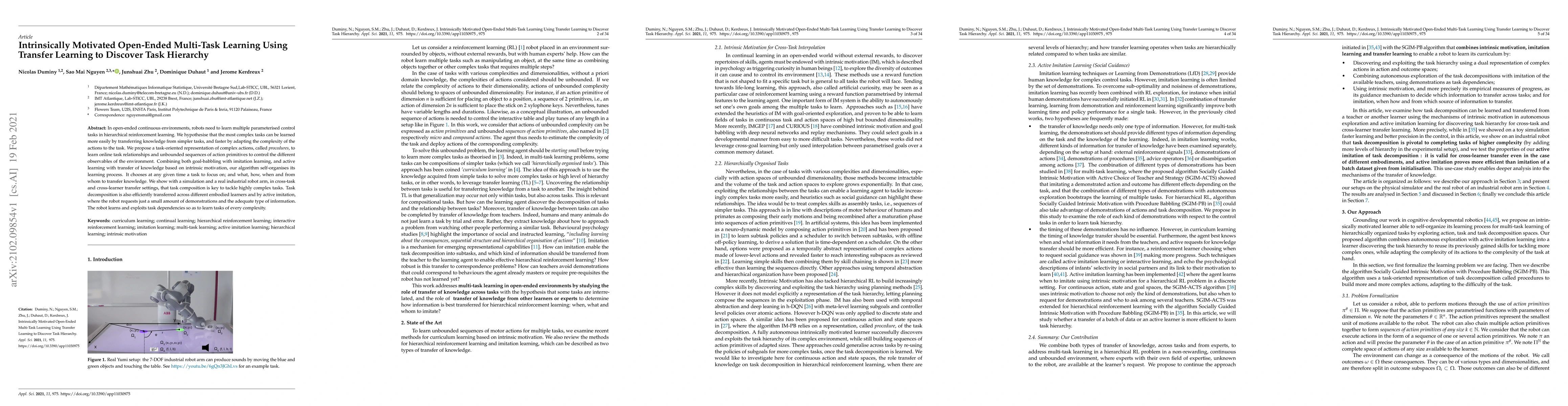 In open-ended continuous environments, robots need to learn multiple parameterised control tasks in hierarchical reinforcement learning. We hypothesise that the most complex tasks can be learned more easily by transferring knowledge from simpler tasks, and faster by adapting the complexity of the actions to the task. We propose a task-oriented representation of complex actions, called procedures, to learn online task relationships and unbounded sequences of action primitives to control the different observables of the environment. Combining both goal-babbling with imitation learning, and active learning with transfer of knowledge based on intrinsic motivation, our algorithm self-organises its learning process. It chooses at any given time a task to focus on; and what, how, when and from whom to transfer knowledge. We show with a simulation and a real industrial robot arm, in cross-task and cross-learner transfer settings, that task composition is key to tackle highly complex tasks. Task decomposition is also efficiently transferred across different embodied learners and by active imitation, where the robot requests just a small amount of demonstrations and the adequate type of information. The robot learns and exploits task dependencies so as to learn tasks of every complexity.