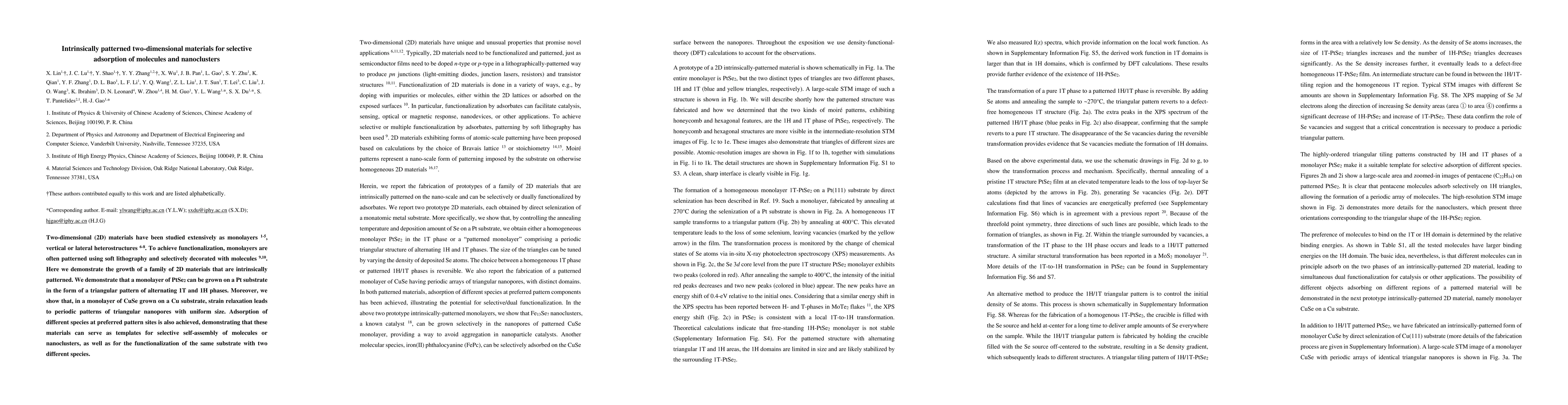 This paper demonstrates the growth of intrinsically patterned two-dimensional materials, such as PtSe2 and CuSe, which exhibit alternating phases or nanopores. These patterns enable selective adsorption of molecules and nanoclusters, showcasing potential for functionalization and self-assembly.