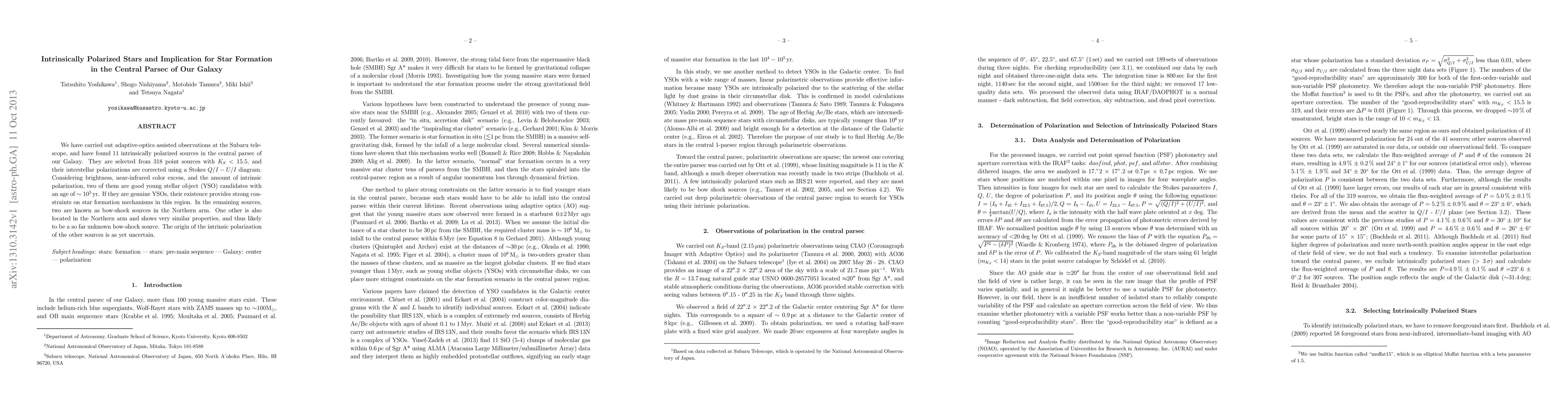 We have carried out adaptive-optics assisted observations at the Subaru telescope, and have found 11 intrinsically polarized sources in the central parsec of our Galaxy. They are selected from 318 point sources with Ks<15.5, and their interstellar polarizations are corrected using a Stokes Q/I - U/I diagram. Considering brightness, near-infrared color excess, and the amount of intrinsic polarization, two of them are good young stellar object (YSO) candidates with an age of ~10^5 yr. If they are genuine YSOs, their existence provides strong constraints on star formation mechanisms in this region. In the remaining sources, two are known as bow-shock sources in the Northern arm. One other is also located in the Northern arm and shows very similar properties, and thus likely to be a so far unknown bow-shock source. The origin of the intrinsic polarization of the other sources is as yet uncertain.