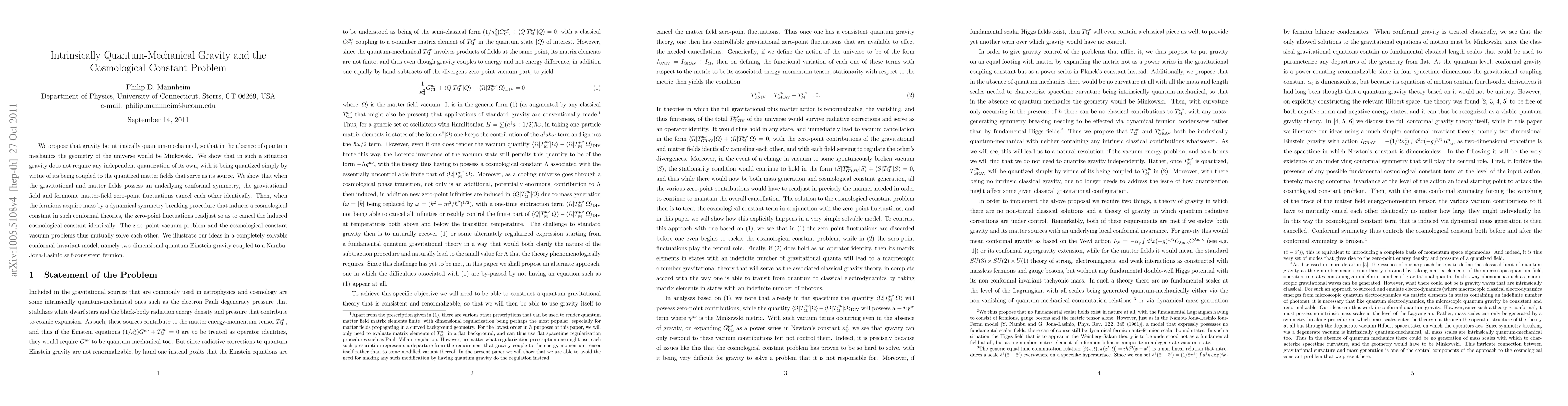 We propose that gravity be intrinsically quantum-mechanical, so that in the absence of quantum mechanics the geometry of the universe would be Minkowski. We show that in such a situation gravity does not require any independent quantization of its own, with it being quantized simply by virtue of its being coupled to the quantized matter fields that serve as its source. We show that when the gravitational and matter fields possess an underlying conformal symmetry, the gravitational field and fermionic matter-field zero-point fluctuations cancel each other identically. Then, when the fermions acquire mass by a dynamical symmetry breaking procedure that induces a cosmological constant in such conformal theories, the zero-point fluctuations readjust so as to cancel the induced cosmological constant identically. The zero-point vacuum problem and the cosmological constant vacuum problems thus mutually solve each other. We illustrate our ideas in a completely solvable conformal-invariant model, namely two-dimensional quantum Einstein gravity coupled to a Nambu-Jona-Lasinio self-consistent fermion.