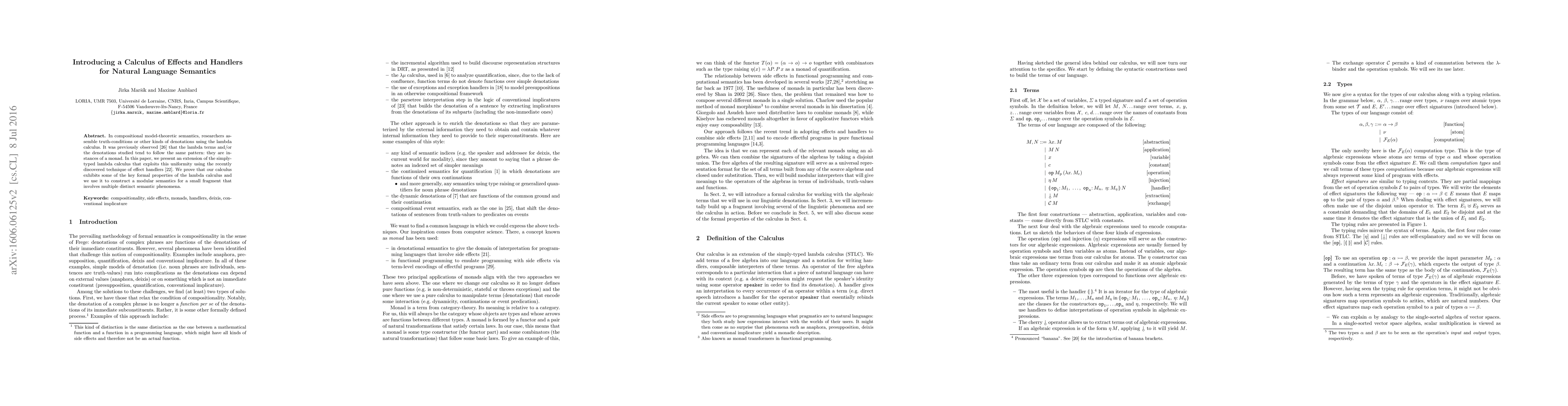 In compositional model-theoretic semantics, researchers assemble truth-conditions or other kinds of denotations using the lambda calculus. It was previously observed that the lambda terms and/or the denotations studied tend to follow the same pattern: they are instances of a monad. In this paper, we present an extension of the simply-typed lambda calculus that exploits this uniformity using the recently discovered technique of effect handlers. We prove that our calculus exhibits some of the key formal properties of the lambda calculus and we use it to construct a modular semantics for a small fragment that involves multiple distinct semantic phenomena.