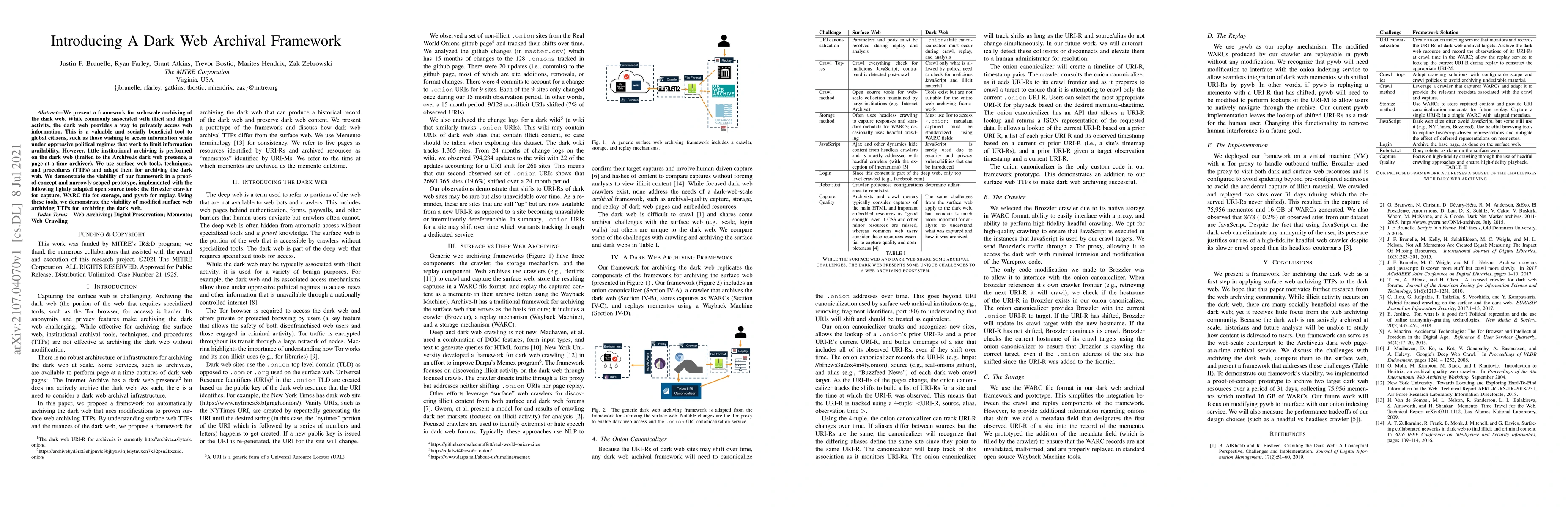 This work introduces a novel approach to dark web archiving, combining focused crawling with web scraping techniques to address the unique challenges of this domain.