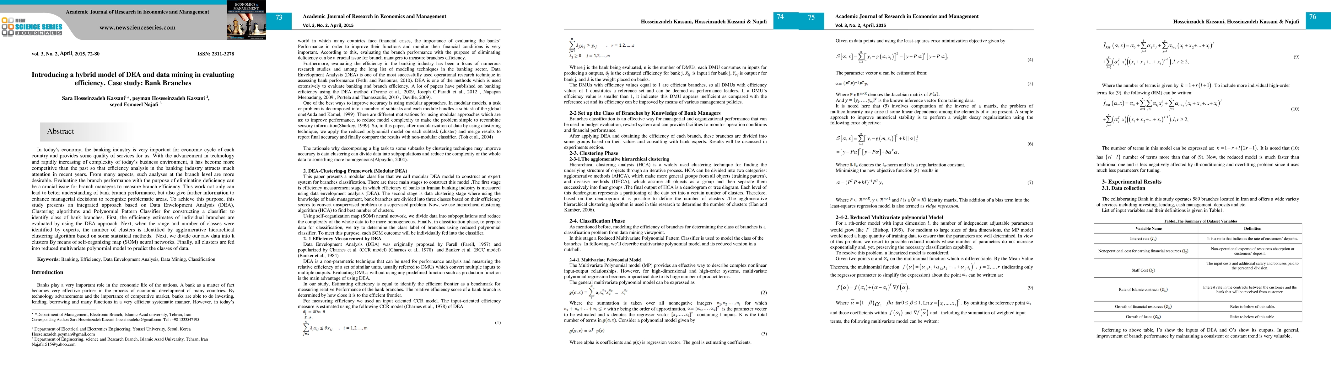 The banking industry is very important for an economic cycle of each country and provides some quality of services for us. With the advancement in technology and rapidly increasing of the complexity of the business environment, it has become more competitive than the past so that efficiency analysis in the banking industry attracts much attention in recent years. From many aspects, such analyses at the branch level are more desirable. Evaluating the branch performance with the purpose of eliminating deficiency can be a crucial issue for branch managers to measure branch efficiency. This work not only can lead to a better understanding of bank branch performance but also give further information to enhance managerial decisions to recognize problematic areas. To achieve this purpose, this study presents an integrated approach based on Data Envelopment Analysis (DEA), Clustering algorithms and Polynomial Pattern Classifier for constructing a classifier to identify a class of bank branches. First, the efficiency estimates of individual branches are evaluated by using the DEA approach. Next, when the range and number of classes were identified by experts, the number of clusters is identified by an agglomerative hierarchical clustering algorithm based on some statistical methods. Next, we divide our raw data into k clusters By means of self-organizing map (SOM) neural networks. Finally, all clusters are fed into the reduced multivariate polynomial model to predict the classes of data.