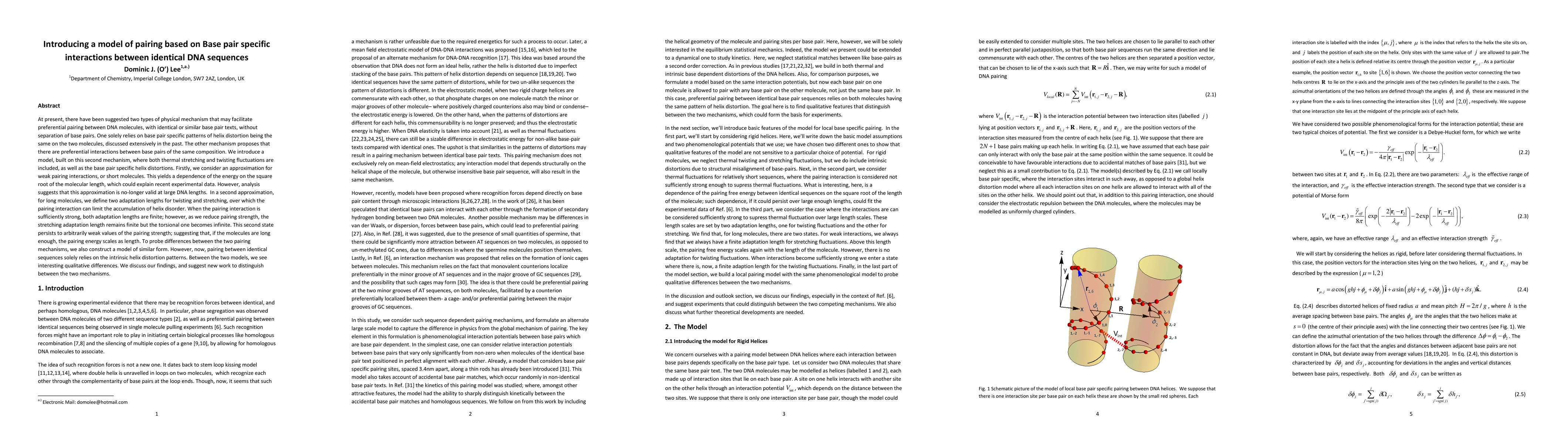 At present, there have been suggested two types of physical mechanism that may facilitate preferential pairing between DNA molecules, with identical or similar base pair texts, without separation of base pairs. One solely relies on base pair specific patterns of helix distortion being the same on the two molecules, discussed extensively in the past. The other mechanism proposes that there are preferential interactions between base pairs of the same composition. We introduce a model, built on this second mechanism, where both thermal stretching and twisting fluctuations are included, as well as the base pair specific helix distortions. Firstly, we consider an approximation for weak pairing interactions, or short molecules. This yields a dependence of the energy on the square root of the molecular length, which could explain recent experimental data. However, analysis suggests that this approximation is no-longer valid at large DNA lengths. In a second approximation, for long molecules, we define two adaptation lengths for twisting and stretching, over which the pairing interaction can limit the accumulation of helix disorder. When the pairing interaction is sufficiently strong, both adaptation lengths are finite; however, as we reduce pairing strength, the stretching adaptation length remains finite but the torsional one becomes infinite. This second state persists to arbitrarily weak values of the pairing strength; suggesting that, if the molecules are long enough, the pairing energy scales as length. To probe differences between the two pairing mechanisms, we also construct a model of similar form. However, now, pairing between identical sequences solely relies on the intrinsic helix distortion patterns. Between the two models, we see interesting qualitative differences. We discuss our findings, and suggest new work to distinguish between the two mechanisms.