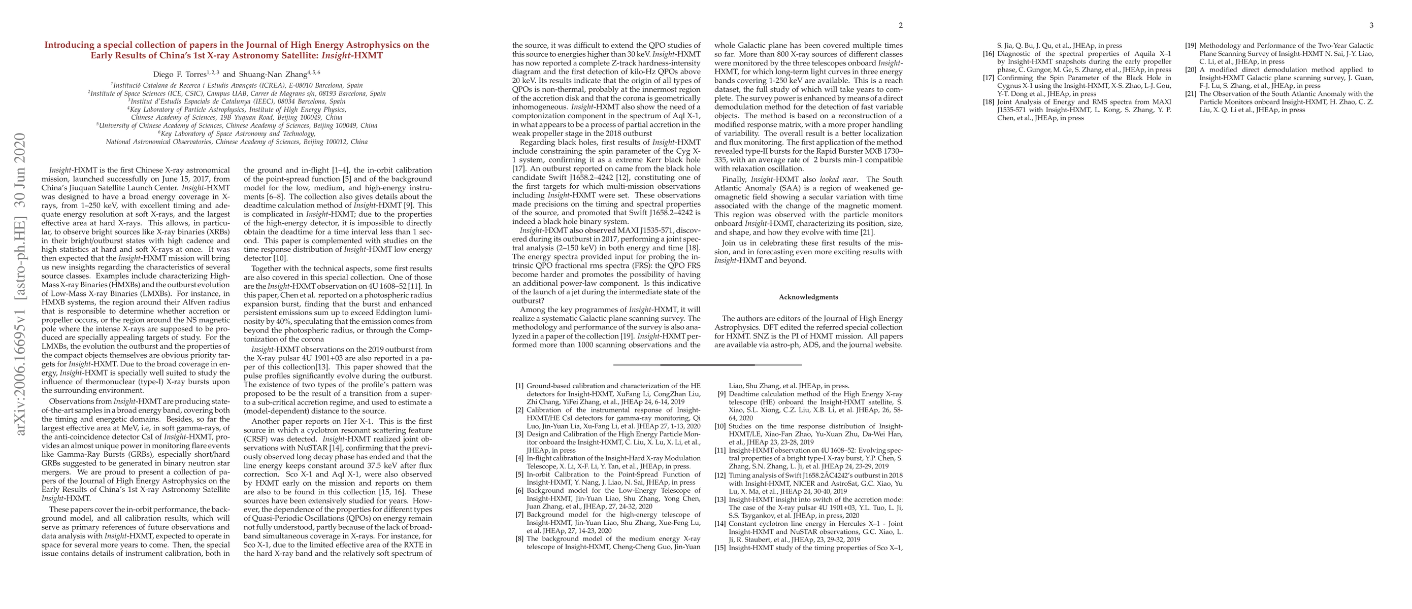 This special collection in the Journal of High Energy Astrophysics presents early findings from China's first X-ray astronomy satellite, Insight-HXMT, focusing on its in-orbit performance, calibration, and initial observations of binaries and the Galactic plane.