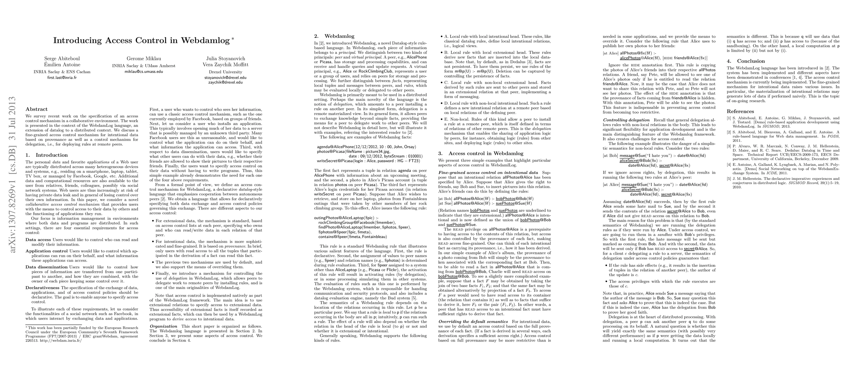 This paper proposes a fine-grained access control mechanism for collaborative environments using the WebdamLog language, focusing on intentional data provenance and a delegation control mechanism for deploying rules at remote peers.