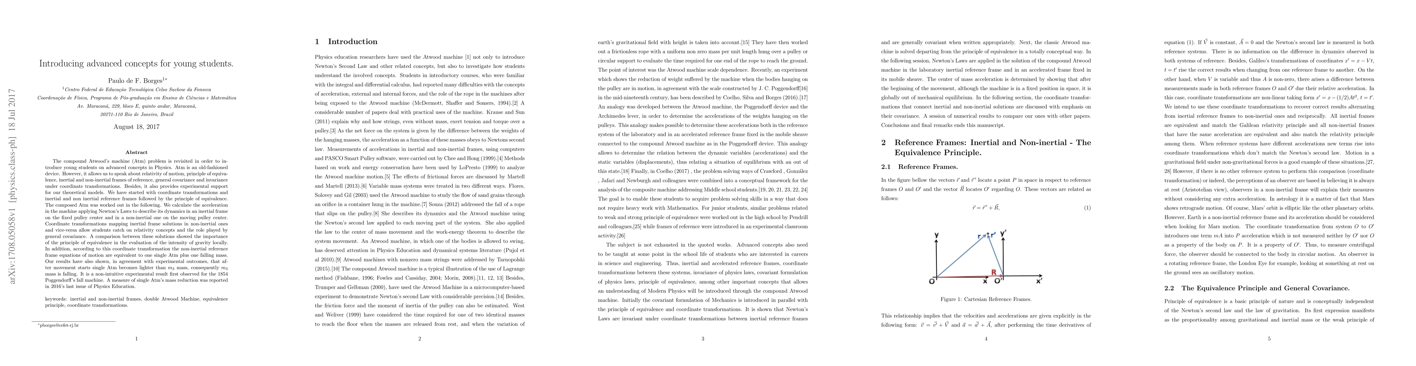 The compound Atwood's machine (Atm) problem is revisited in order to introduce young students on advanced concepts in Physics. Atm is an old-fashioned device. However, it allows us to speak about relativity of motion, principle of equivalence, inertial and non-inertial frames of reference, general covariance and invariance under coordinate transformations. Besides, it also provides experimental support for our theoretical models. We have started with coordinate transformations and inertial and non inertial reference frames followed by the principle of equivalence. The composed Atm was worked out in the following. We calculate the acceleration in the machine applying Newton's Laws to describe its dynamics in an inertial frame on the fixed pulley center and in a non-inertial one on the moving pulley center. Coordinate transformations mapping inertial frame solutions in non-inertial ones and vice-versa allow students catch on relativity concepts and the role played by general covariance. A comparison between these solutions showed the importance of the principle of equivalence in the evaluation of the intensity of gravity locally. In addition, according to this coordinate transformation the non-inertial reference frame equations of motion are equivalent to one single Atm plus one falling mass. Our results have also shown, in agreement with experimental outcomes, that after movement starts single Atm becomes lighter than $m_{3}$ mass, consequently $m_{3}$ mass is falling. It is a non-intuitive experimental result first observed for the 1854 Poggendorff's fall machine. A measure of single Atm's mass reduction was reported in 2016's last issue of Physics Education.