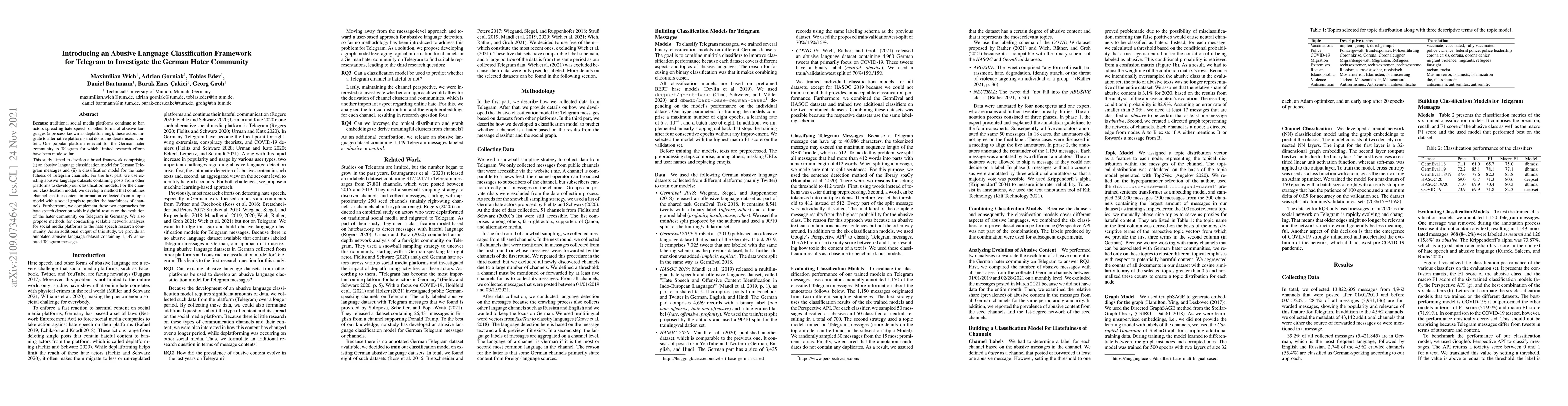 Since traditional social media platforms continue to ban actors spreading hate speech or other forms of abusive languages (a process known as deplatforming), these actors migrate to alternative platforms that do not moderate users content. One popular platform relevant for the German hater community is Telegram for which limited research efforts have been made so far. This study aims to develop a broad framework comprising (i) an abusive language classification model for German Telegram messages and (ii) a classification model for the hatefulness of Telegram channels. For the first part, we use existing abusive language datasets containing posts from other platforms to develop our classification models. For the channel classification model, we develop a method that combines channel-specific content information collected from a topic model with a social graph to predict the hatefulness of channels. Furthermore, we complement these two approaches for hate speech detection with insightful results on the evolution of the hater community on Telegram in Germany. We also propose methods for conducting scalable network analyses for social media platforms to the hate speech research community. As an additional output of this study, we provide an annotated abusive language dataset containing 1,149 annotated Telegram messages.