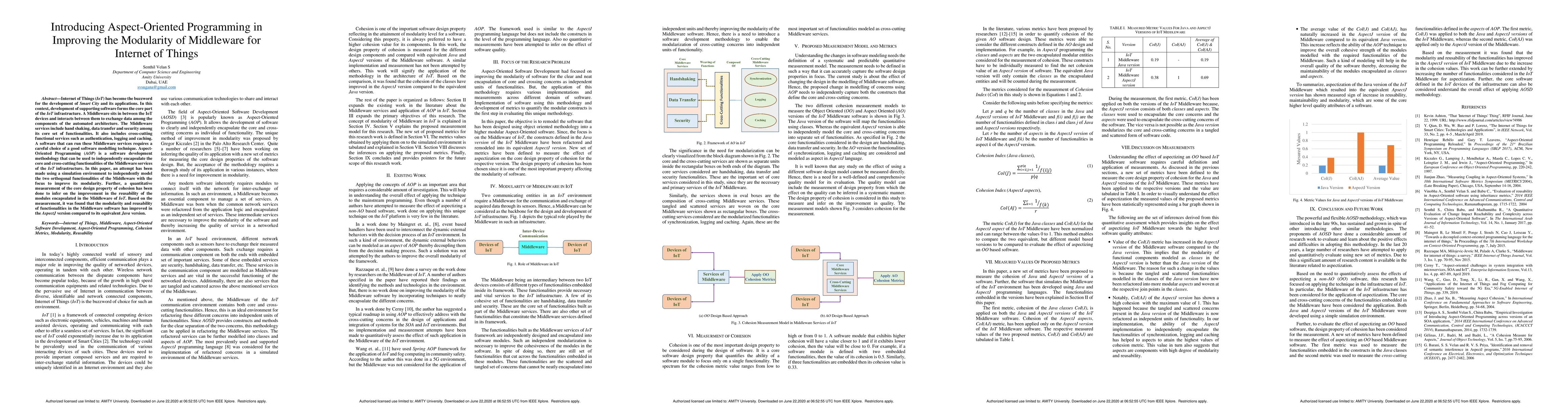 Internet of Things (IoT) has become the buzzword for the development of Smart City and its applications. In this context, development of supporting software forms the core part of the IoT infrastructure. A Middleware sits in between the IoT devices and interacts between them to exchange data among the components of the automated architecture. The Middleware services include hand shaking, data transfer and security among its core set of functionalities. It also includes cross-cutting functional services such as authentication, logging and caching. A software that can run these Middleware services requires a careful choice of a good software modelling technique. Aspect-Oriented Programming (AOP) is a software development methodology that can be used to independently encapsulate the core and cross-cutting functionalities of the Middleware services of the IoT infrastructure. In this paper, an attempt has been made using a simulation environment to independently model the two orthogonal functionalities of the Middleware with the focus to improve its modularity. Further, a quantitative measurement of the core design property of cohesion has been done to infer on the improvement in the reusability of the modules encapsulated in the Middleware of IoT. Based on the measurement, it was found that the modularity and reusability of functionalities in the Middleware software has improved in the AspectJ version compared to its equivalent Java version.