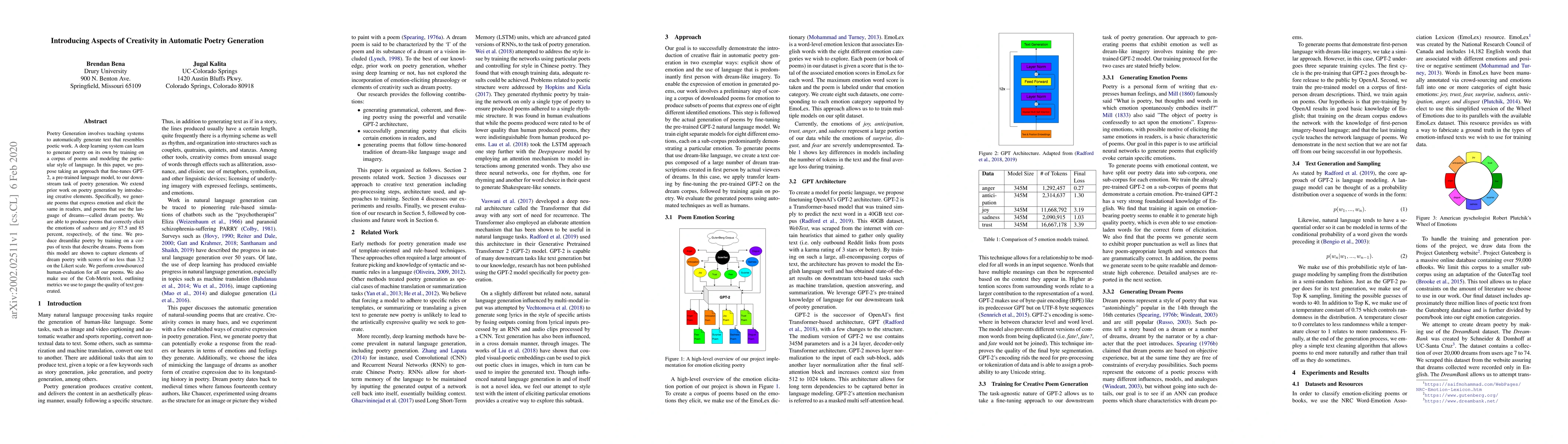 Poetry Generation involves teaching systems to automatically generate text that resembles poetic work. A deep learning system can learn to generate poetry on its own by training on a corpus of poems and modeling the particular style of language. In this paper, we propose taking an approach that fine-tunes GPT-2, a pre-trained language model, to our downstream task of poetry generation. We extend prior work on poetry generation by introducing creative elements. Specifically, we generate poems that express emotion and elicit the same in readers, and poems that use the language of dreams---called dream poetry. We are able to produce poems that correctly elicit the emotions of sadness and joy 87.5 and 85 percent, respectively, of the time. We produce dreamlike poetry by training on a corpus of texts that describe dreams. Poems from this model are shown to capture elements of dream poetry with scores of no less than 3.2 on the Likert scale. We perform crowdsourced human-evaluation for all our poems. We also make use of the Coh-Metrix tool, outlining metrics we use to gauge the quality of text generated.