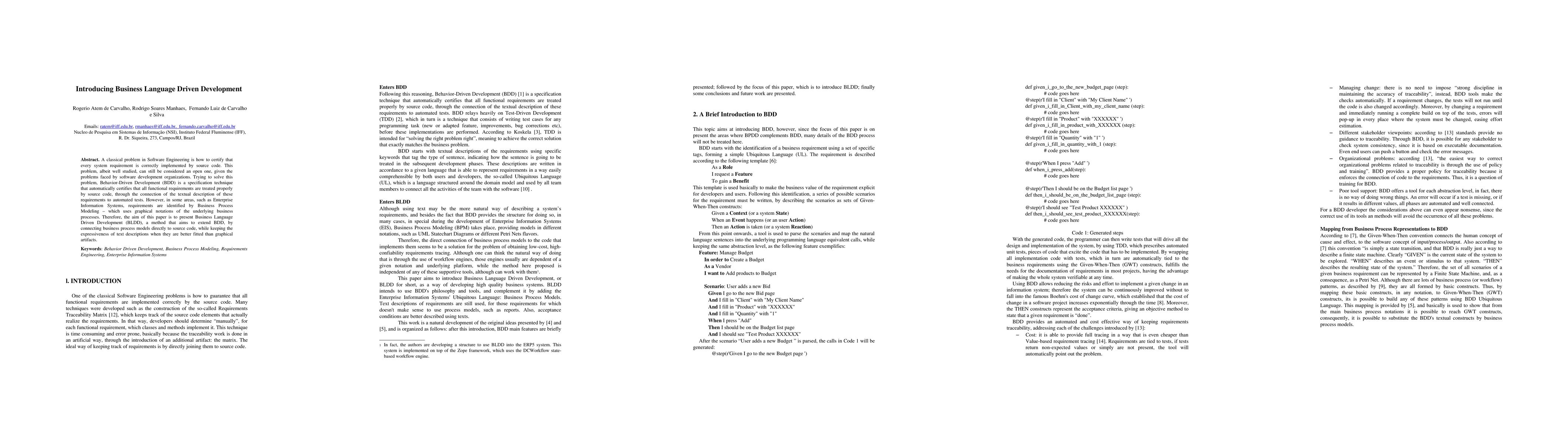 A classical problem in Software Engineering is how to certify that every system requirement is correctly implemented by source code. This problem, albeit well studied, can still be considered an open one, given the problems faced by software development organizations. Trying to solve this problem, Behavior-Driven Development (BDD) is a specification technique that automatically certifies that all functional requirements are treated properly by source code, through the connection of the textual description of these requirements to automated tests. However, in some areas, such as Enterprise Information Systems, requirements are identified by Business Process Modeling - which uses graphical notations of the underlying business processes. Therefore, the aim of this paper is to present Business Language Driven Development (BLDD), a method that aims to extend BDD, by connecting business process models directly to source code, while keeping the expressiveness of text descriptions when they are better fitted than graphical artifacts.