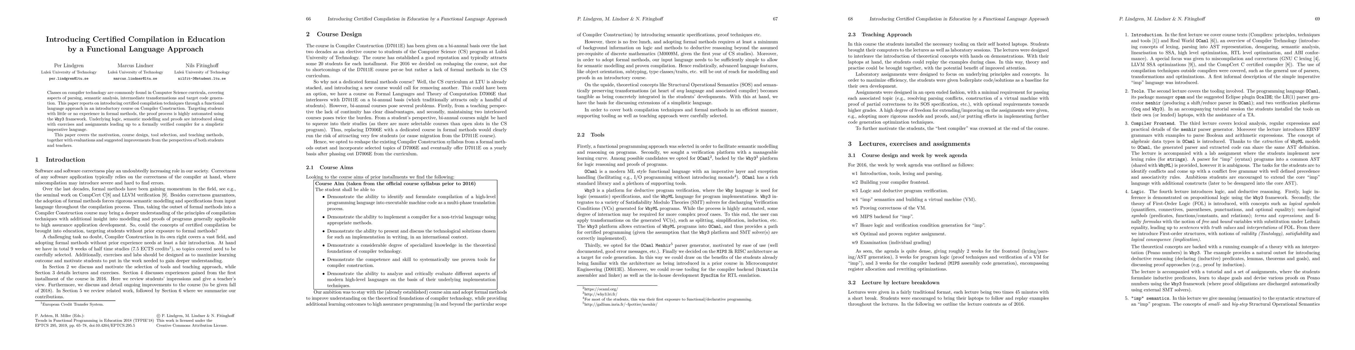 Classes on compiler technology are commonly found in Computer Science curricula, covering aspects of parsing, semantic analysis, intermediate transformations and target code generation. This paper reports on introducing certified compilation techniques through a functional language approach in an introductory course on Compiler Construction. Targeting students with little or no experience in formal methods, the proof process is highly automated using the Why3 framework. Underlying logic, semantic modelling and proofs are introduced along with exercises and assignments leading up to a formally verified compiler for a simplistic imperative language. This paper covers the motivation, course design, tool selection, and teaching methods, together with evaluations and suggested improvements from the perspectives of both students and teachers.