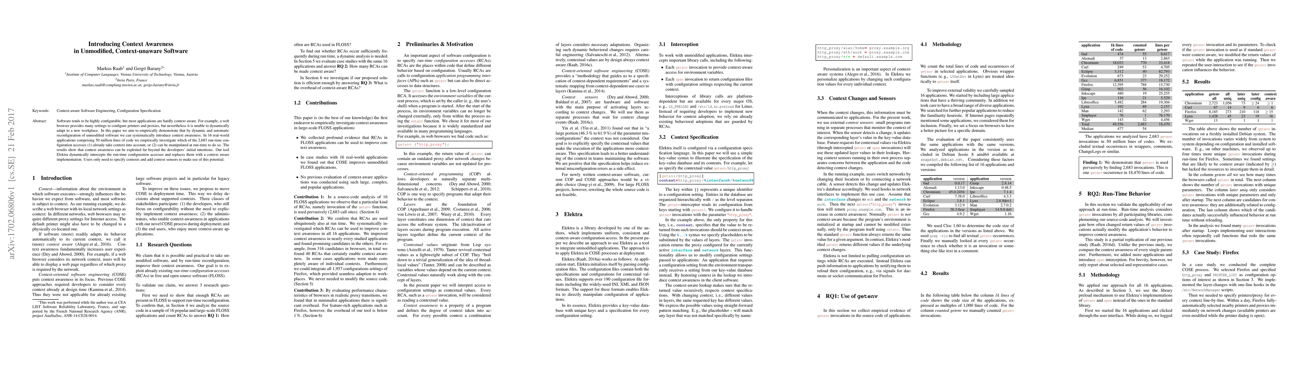 Software tends to be highly configurable, but most applications are hardly context aware. For example, a web browser provides many settings to configure printers and proxies, but nevertheless it is unable to dynamically adapt to a new workplace. In this paper we aim to empirically demonstrate that by dynamic and automatic reconfiguration of unmodified software we can systematically introduce context awareness. In 16 real-world applications comprising 50 million lines of code we empirically investigate which of the 2,683 run-time configuration accesses (1) already take context into account, or (2) can be manipulated at run-time to do so. The results show that context awareness can be exploited far beyond the developers' initial intentions. Our tool Elektra dynamically intercepts the run-time configuration accesses and replaces them with a context aware implementation. Users only need to specify contexts and add context sensors to make use of this potential.