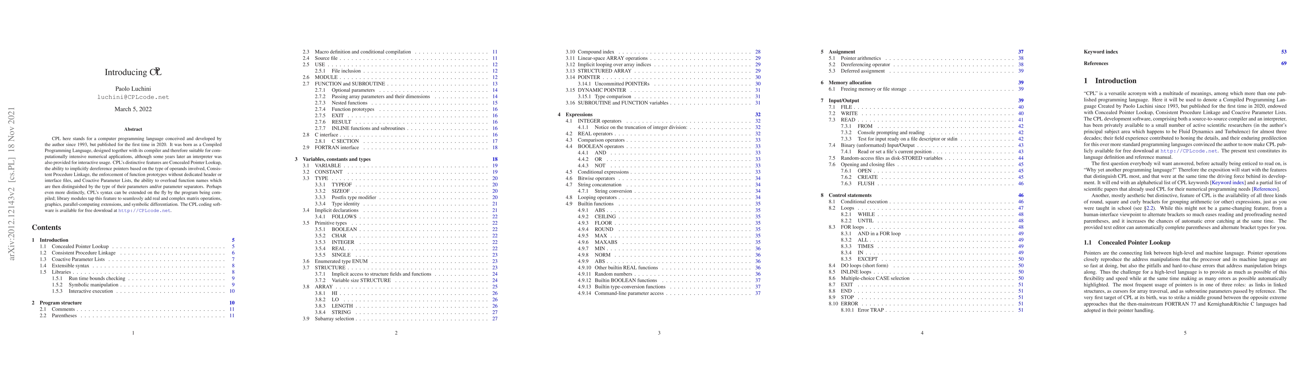 CPL here stands for a computer programming language conceived and developed by the author since 1993, but published for the first time in 2020. It was born as a Compiled Programming Language, designed together with its compiler and therefore suitable for computationally intensive numerical applications, although some years later an interpreter was also provided for interactive usage. CPL's distinctive features are Concealed Pointer Lookup, the ability to implicitly dereference pointers based on the type of operands involved, Consistent Procedure Linkage, the enforcement of function prototypes without dedicated header or interface files, and Coactive Parameter Lists, the ability to overload function names which are then distinguished by the type of their parameters and/or parameter separators. Perhaps even more distinctly, CPL's syntax can be extended on the fly by the program being compiled; library modules tap this feature to seamlessly add real and complex matrix operations, graphics, parallel-computing extensions, and symbolic differentiation. The CPL coding software is available for free download at http://CPLcode.net .
