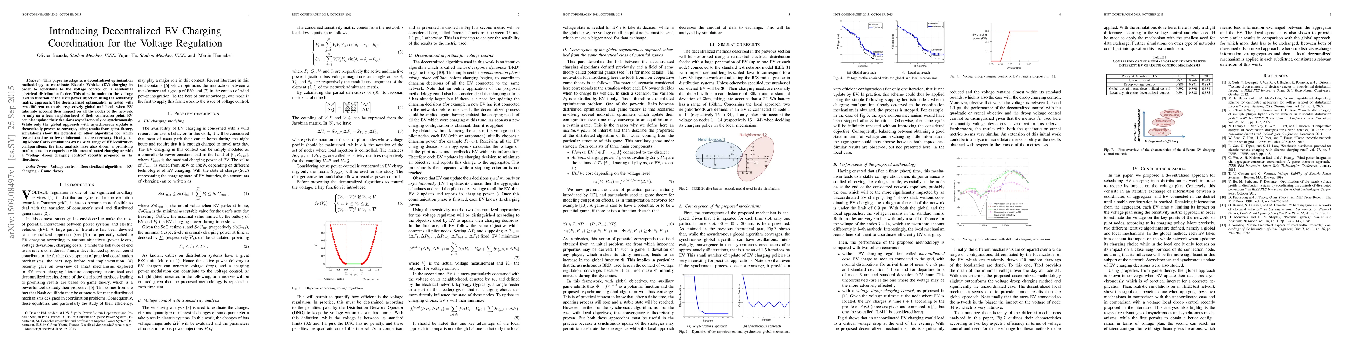 This paper investigates a decentralized optimization methodology to coordinate Electric Vehicles (EV) charging in order to contribute to the voltage control on a residential electrical distribution feeder. This aims to maintain the voltage level in function of the EV's power injection using the sensitivity matrix approach. The decentralized optimization is tested with two different methods, respectively global and local, when EV take into account their impact on all the nodes of the network or only on a local neighborhood of their connection point. EV can also update their decisions asynchronously or synchronously. While only the global approach with asynchronous update is theoretically proven to converge, using results from game theory, simulations show the potential of other algorithms for which fewer iterations or fewer informations are necessary. Finally, using Monte Carlo simulations over a wide range of EV localization configurations, the first analysis have also shown a promising performance in comparison with uncoordinated charging or with a "voltage droop charging control" recently proposed in the literature.