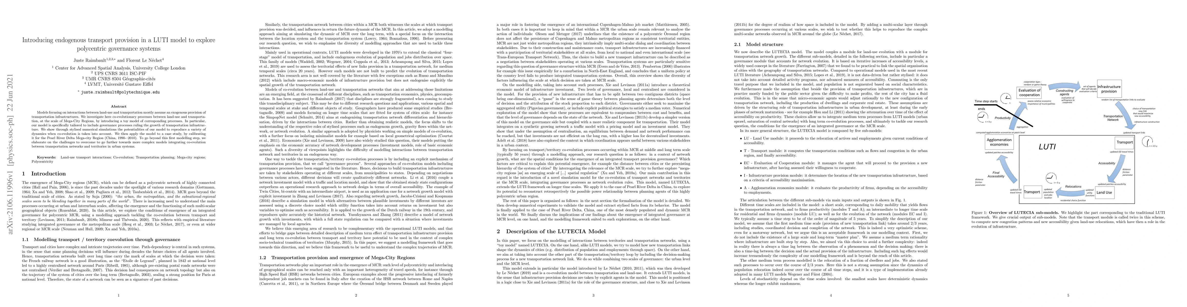 Models focusing on interactions between land-use and transportation mostly assume an exogenous provision of transportation infrastructures. We investigate here co-evolutionary processes between land-use and transportation, at the scale of Mega-City Regions, by introducing a toy model of corresponding processes. In particular, our model is specifically tailored to include governance processes ruling the growth of transportation infrastructure. We show through stylised numerical simulations the potentialities of our model to reproduce a variety of dynamics when co-evolution is taken into account. We then apply the model to a case study, by calibrating it for the Pearl River Delta Mega-city Region (China, 1990-2010). To go beyond this first modelling step, we elaborate on the challenges to overcome to go further towards more complex models integrating co-evolution between transportation networks and territories in urban systems.